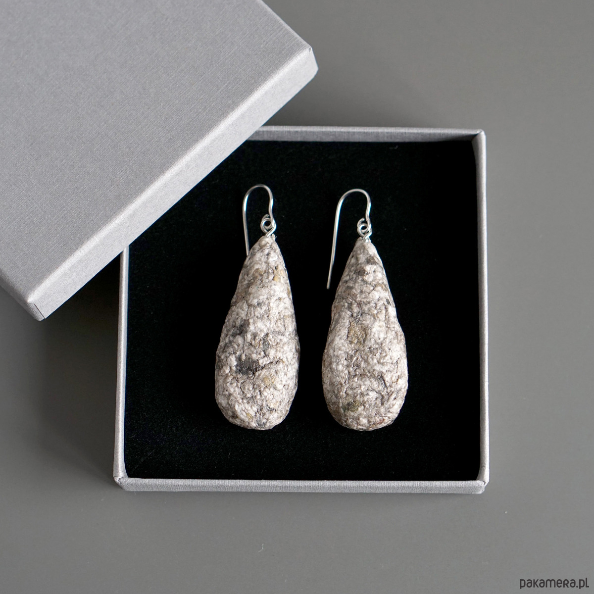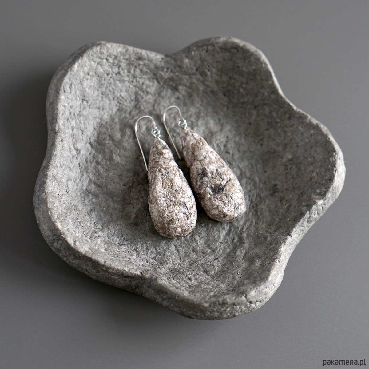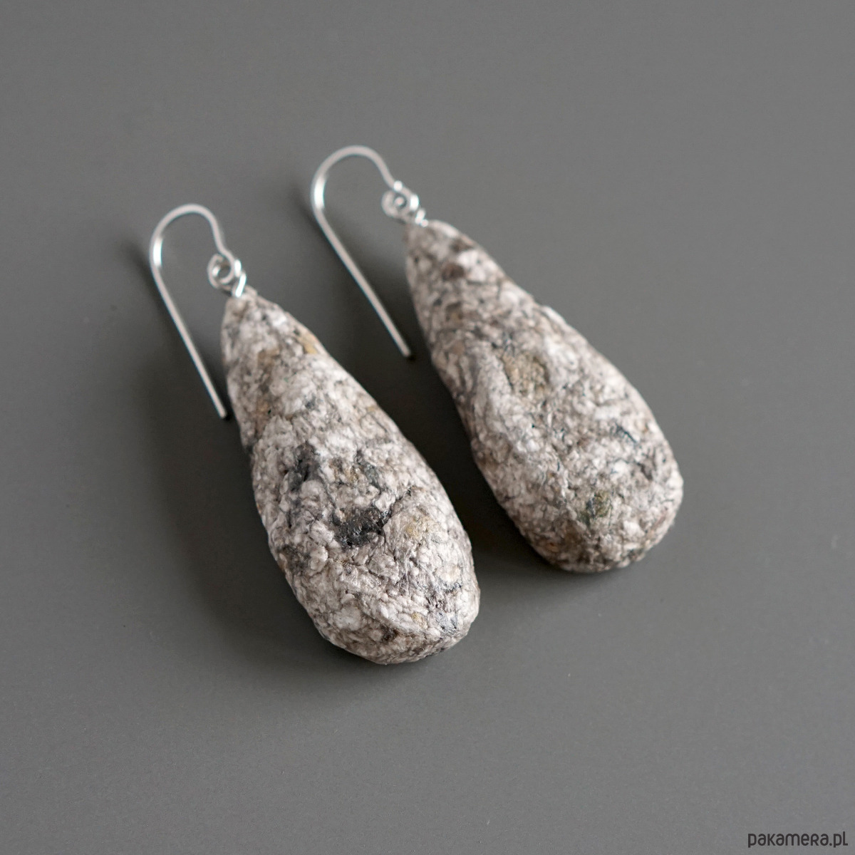 Każdy element powstał z ręcznie przygotowanej masy papierowej z recyklingu, dzięki czemu kolczyki mają charakterystyczną, chropowatą i organiczną fakturę, przypominającą powierzchnię naturalnych kamieni.