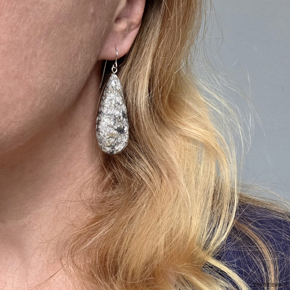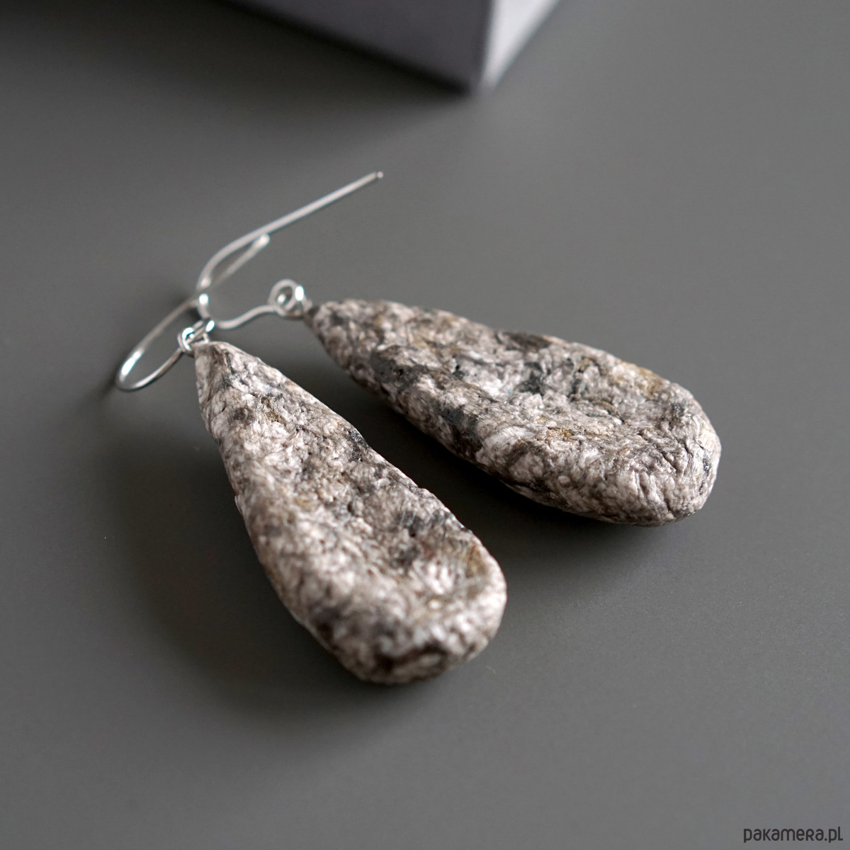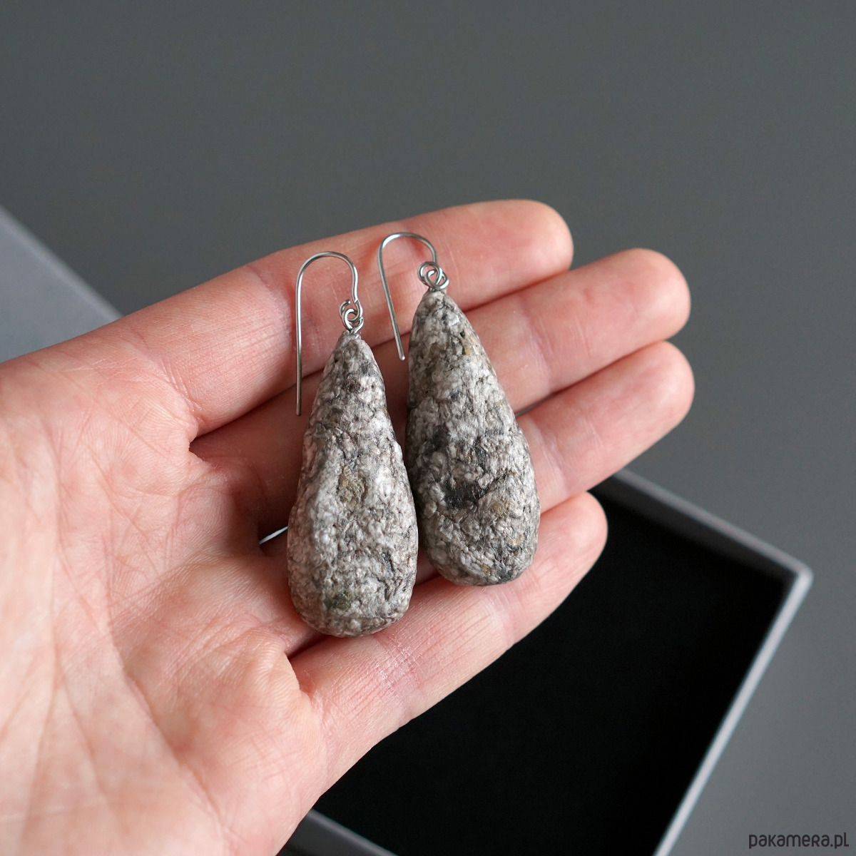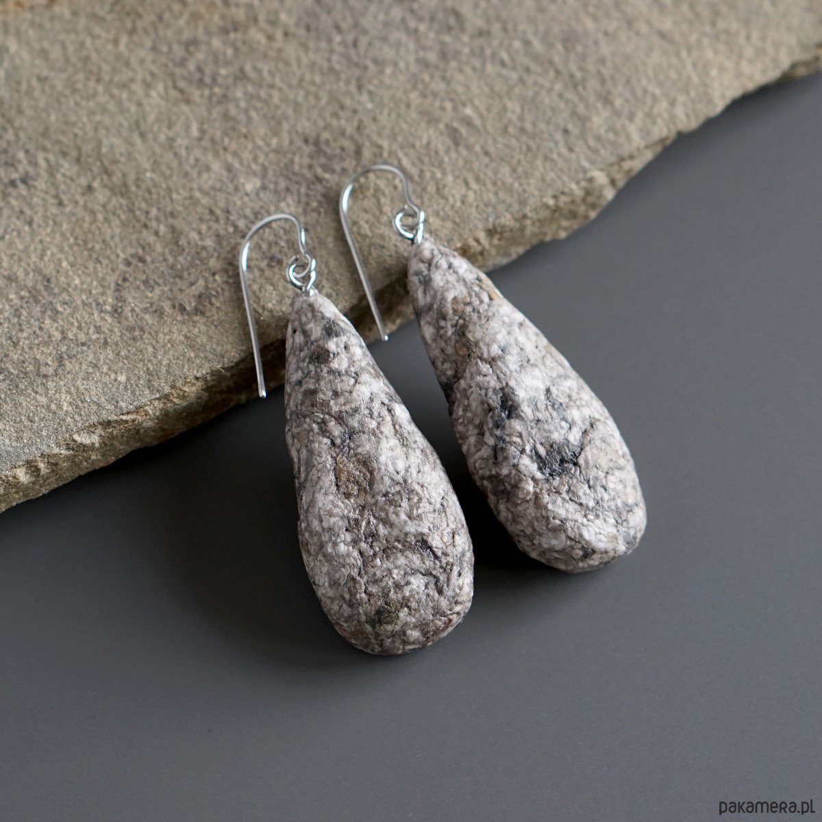 Każdy element powstał z ręcznie przygotowanej masy papierowej z recyklingu, dzięki czemu kolczyki mają charakterystyczną, chropowatą i organiczną fakturę, przypominającą powierzchnię naturalnych kamieni.