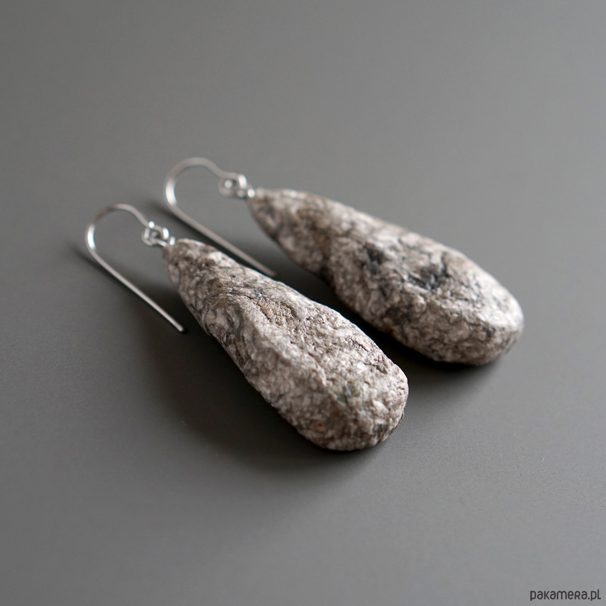 Długie wiszące kolczyki z masy papierowej, ręcznie formowane w kształt surowych, kamiennych sopli.