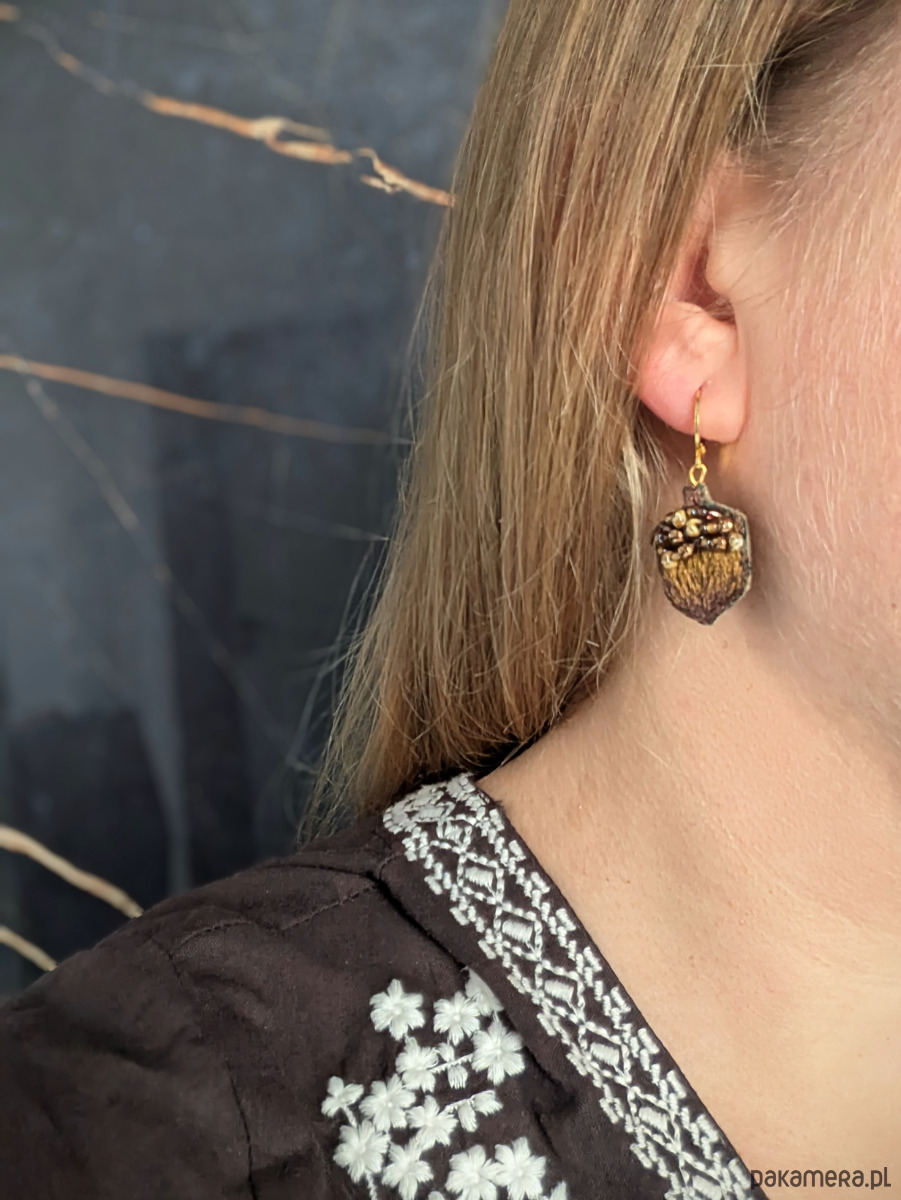 Ręcznie haftowane kolczyki w kształcie żołędzi to biżuteria, która przenosi wprost do jesiennego lasu. Każdy detal został dopracowany z ogromną dbałością – charakterystyczna „czapeczka” żołędzia została stworzona z błyszczących, przyszywanych koralików, które pięknie odbijają światło i nadają całości wyjątkowej faktury.