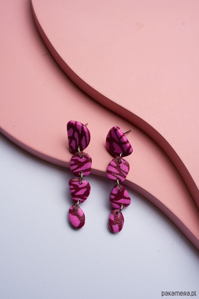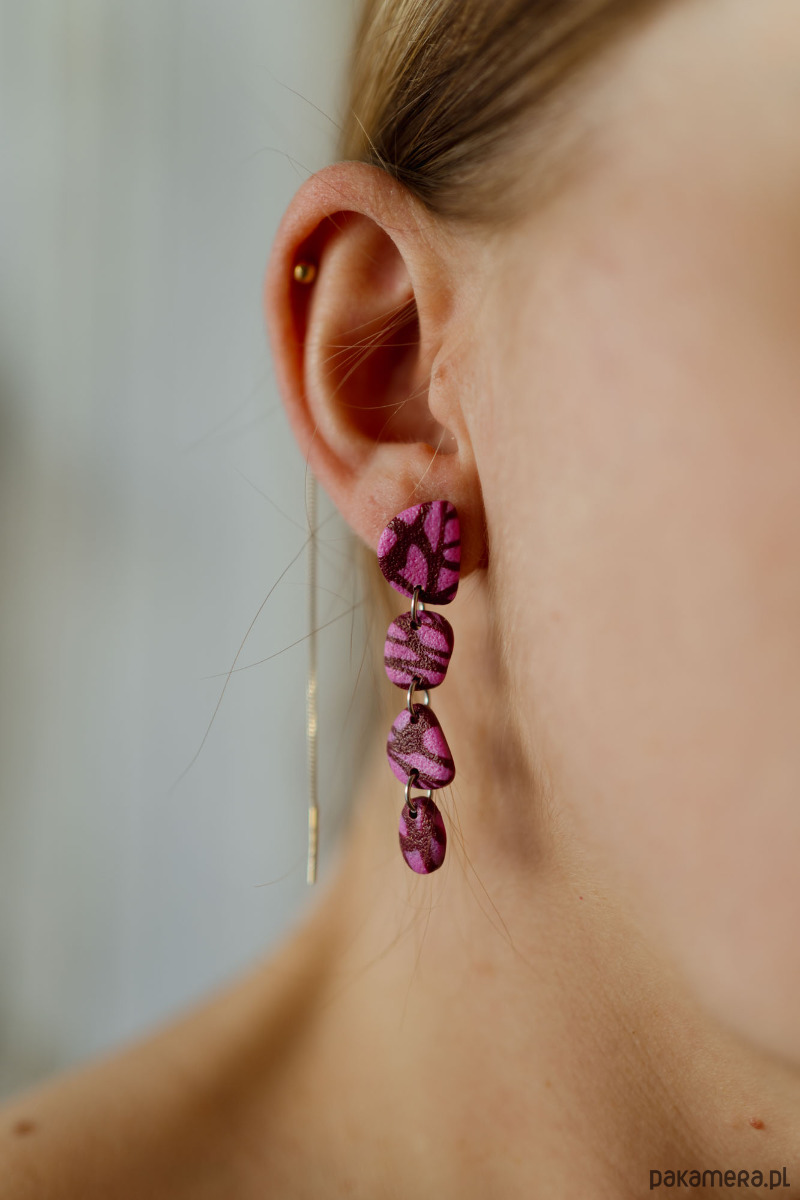 Wiszące sztyfty łańcuszki w abstrakcyjny wzorek. Tworzone ręcznie z ultralekkiej gliny polimerowej z dbałością o każdy szczegół. Tworzę dla oryginalnych kobiet, które przez strój i dodatki chcą wyrazić siebie.