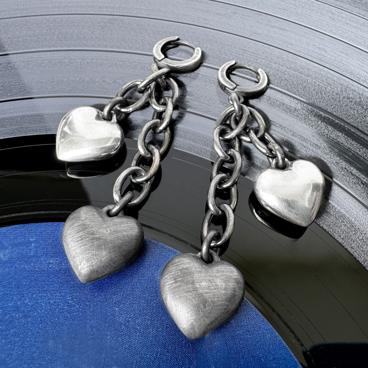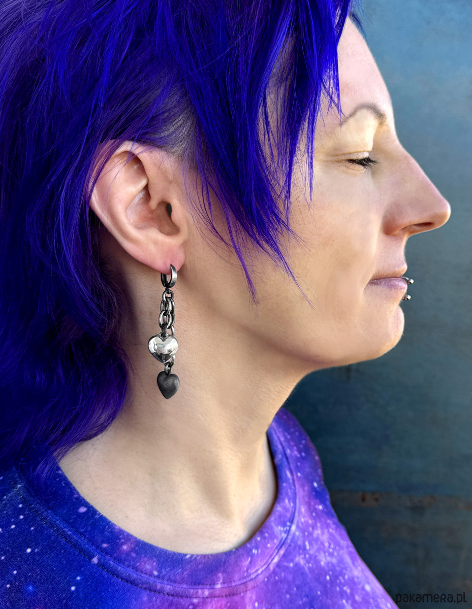Wiszące, autorskie kolczyki wykonane z polerowanego oraz oksydowanego srebra próby 925. Odjazdowy dodatek do casualowych kreacji. Ciemne srebro, skontrastowane z jasnym polerowanym, tworzy bardzo intrygującą grę. Idealny wybór, jeśli chcesz wyrazić swój temperament i osobowość ciekawą biżuterią.