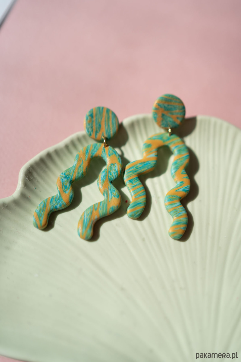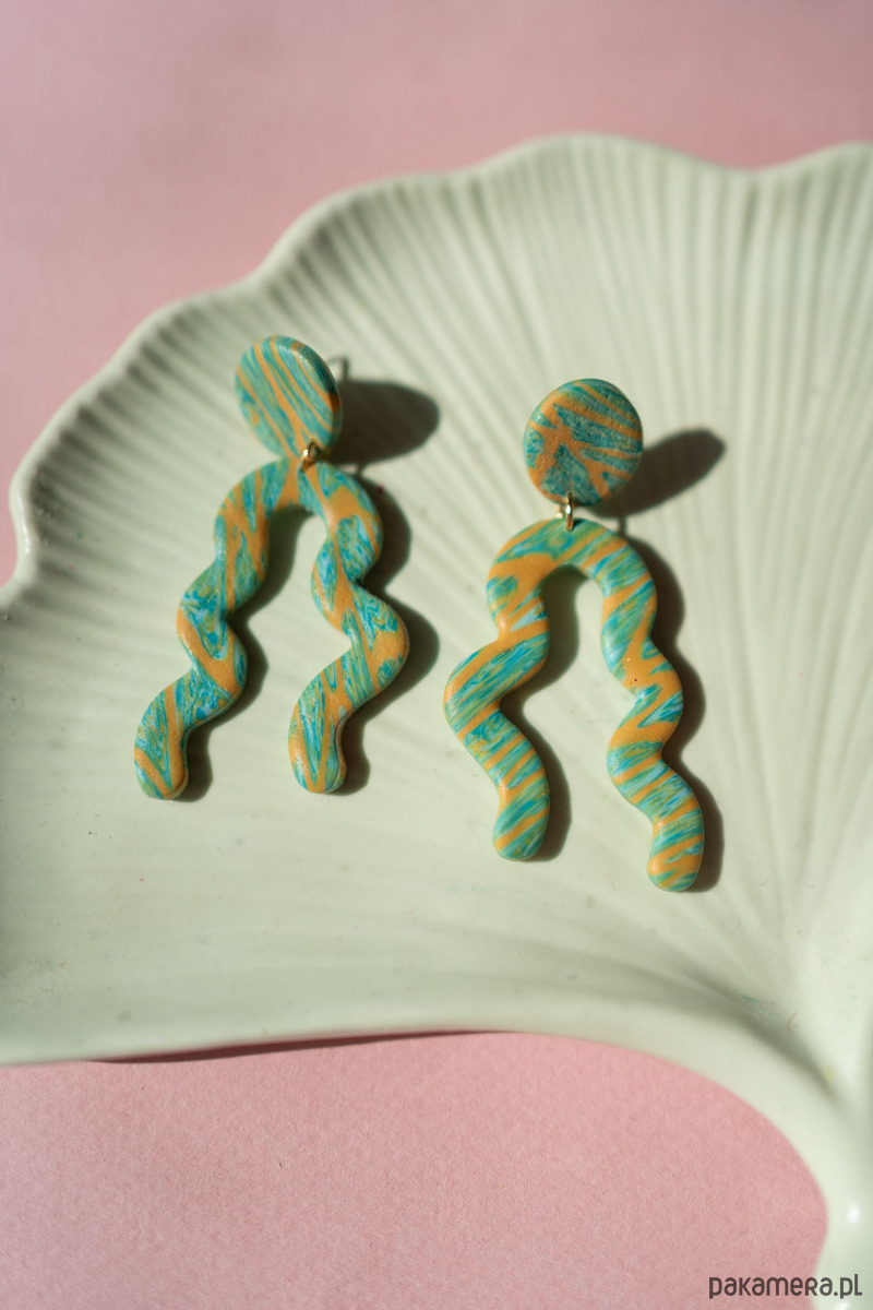 Wiszące kolczyki BRIDGET. w scandi stylu w abstrakcyjny wzorek. Każdy element jest wykonany, wycinany i szlifowany ręcznie z dbałością o każdy szczegół.