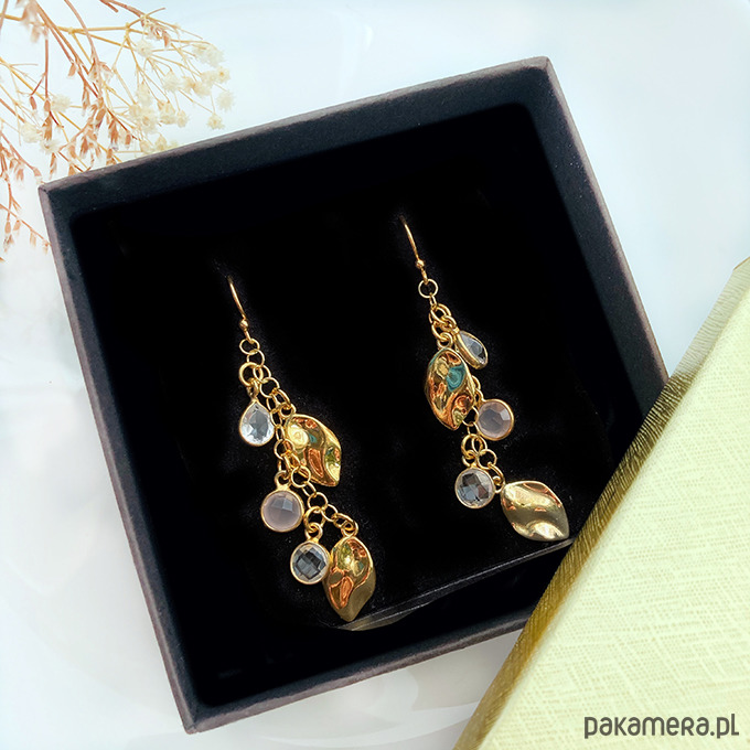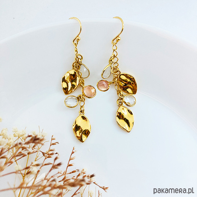 Piękne wiszące kolczyki z zawieszkami Z NATURALNYMI kamieniami , chalcedonem, kamieniem księżycowym i kryształem górskim. Kamienie są fasetowane ( czyli szlifowane pod różnymi kątami, tak aby tworzyły się ukośnie ścięte krawędzie) i oprawione , przepięknie mienią się w słońcu i tańczą z każdym ruchem. Dodatkowo złote zawieszki wyglądają bardzo efektownie w połączeniu z kamieniami. Kolczyki są utrzymane w tonacji jasno kremowo różowej, są lekkie i wygodne w noszeniu. Wykonane ze srebra próby 925 i złocone.