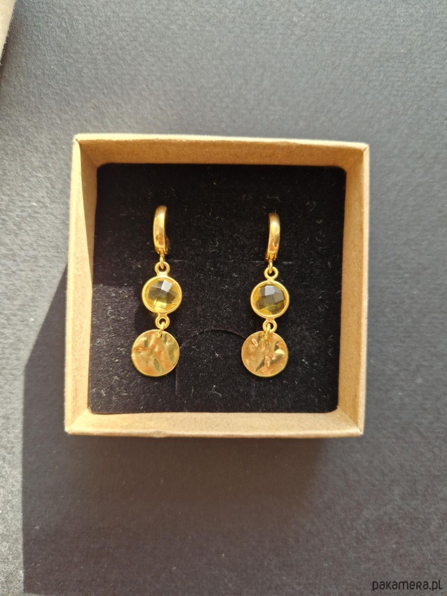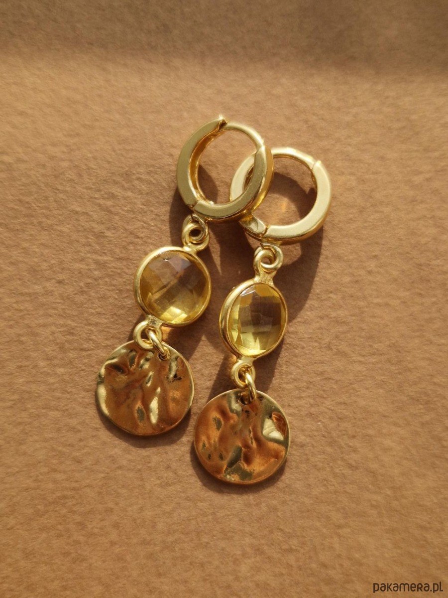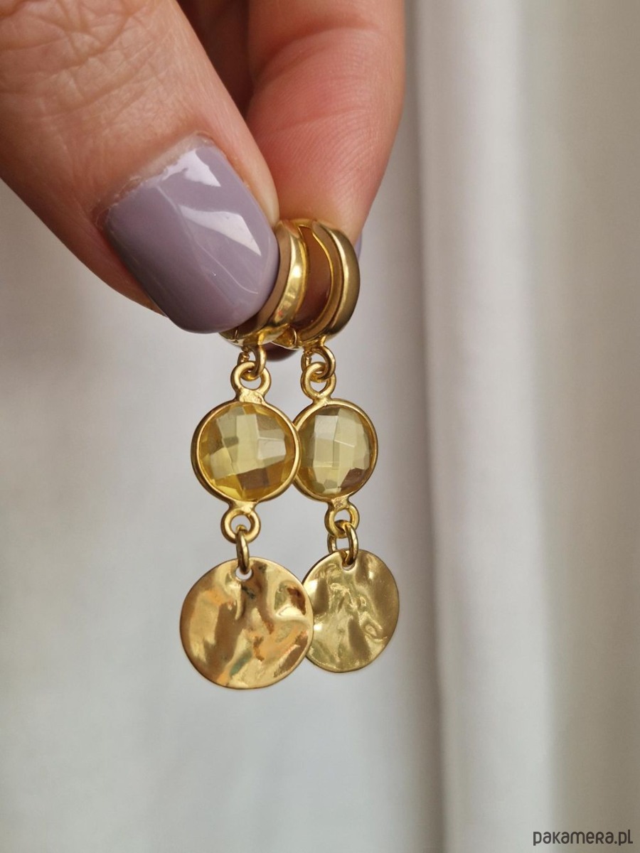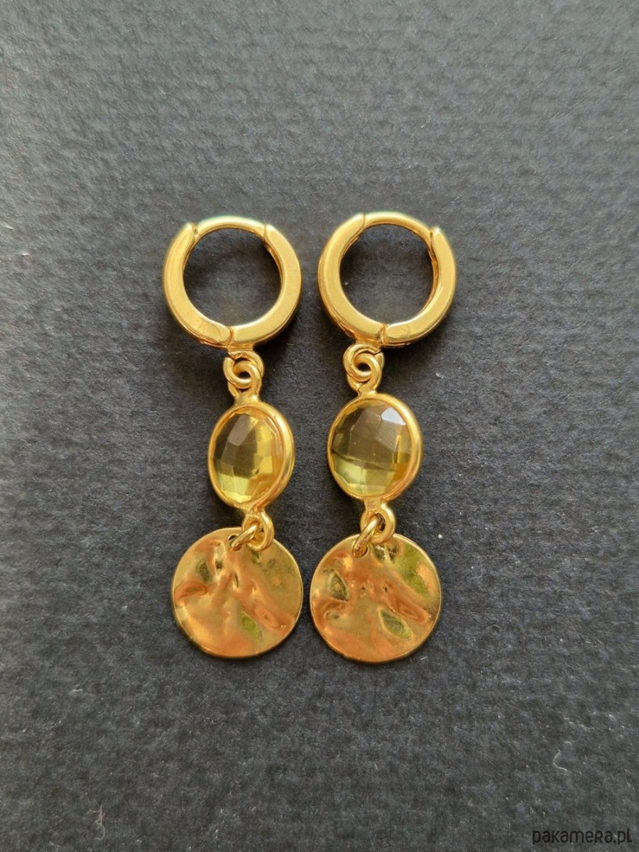 Wyjątkowe, wiszące kolczyki ze złocistymi cytrynami. Cytryny i kółka z pozłacanego srebra zostały podwieszone na biglu angielskim. Całość wykonana z pozłacanego srebra 925. Bardzo eleganckie i intrygujące kolczyki odnajdą się w każdej stylizacji.