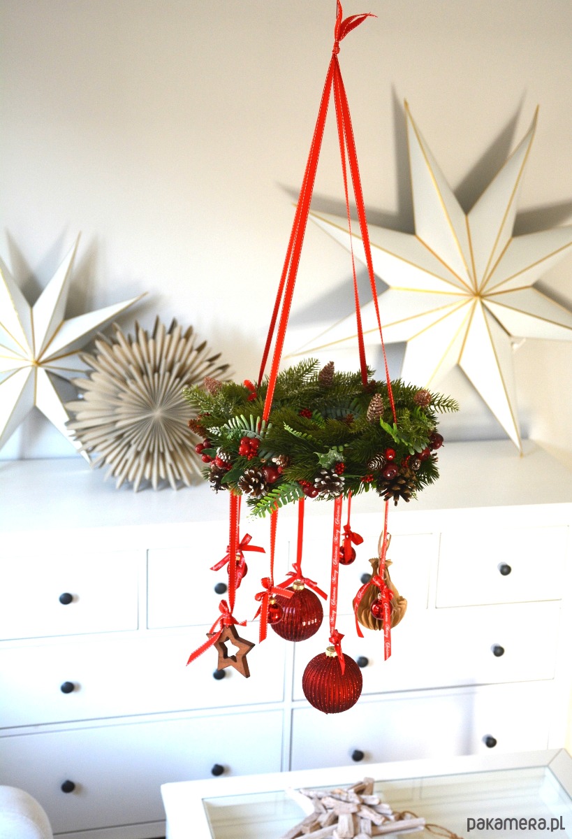 Świąteczny wieniec wiszący w odcieniach czerwieni i zieleni, z mnóstwem zimowych dodatków i ozdobnych wstążek. Magiczna dekoracja na Boże Narodzenie, do powieszenia nad stół, okno lub każdy inny kątek.