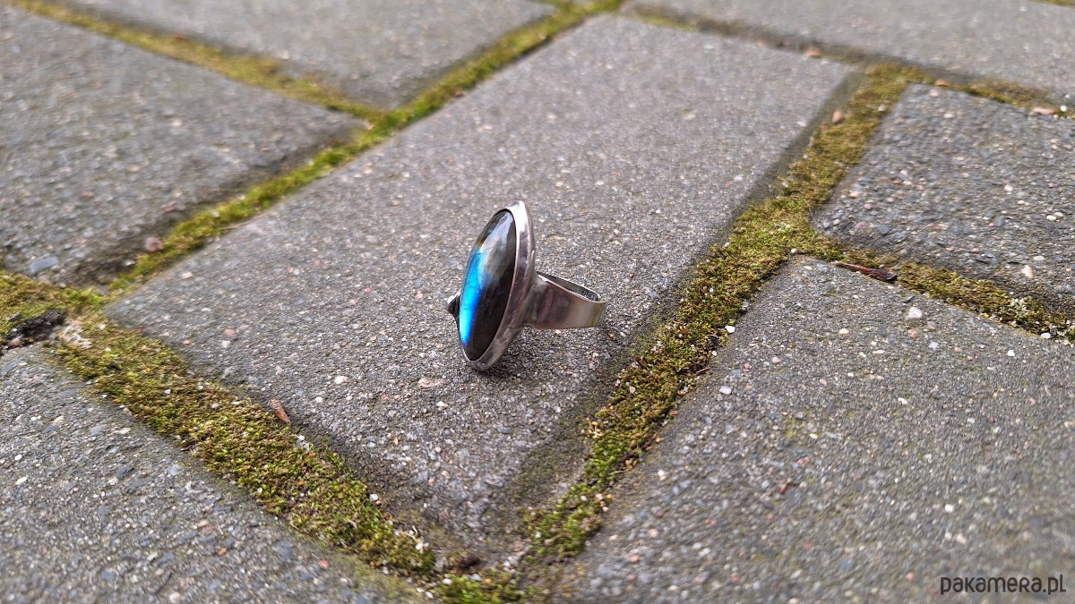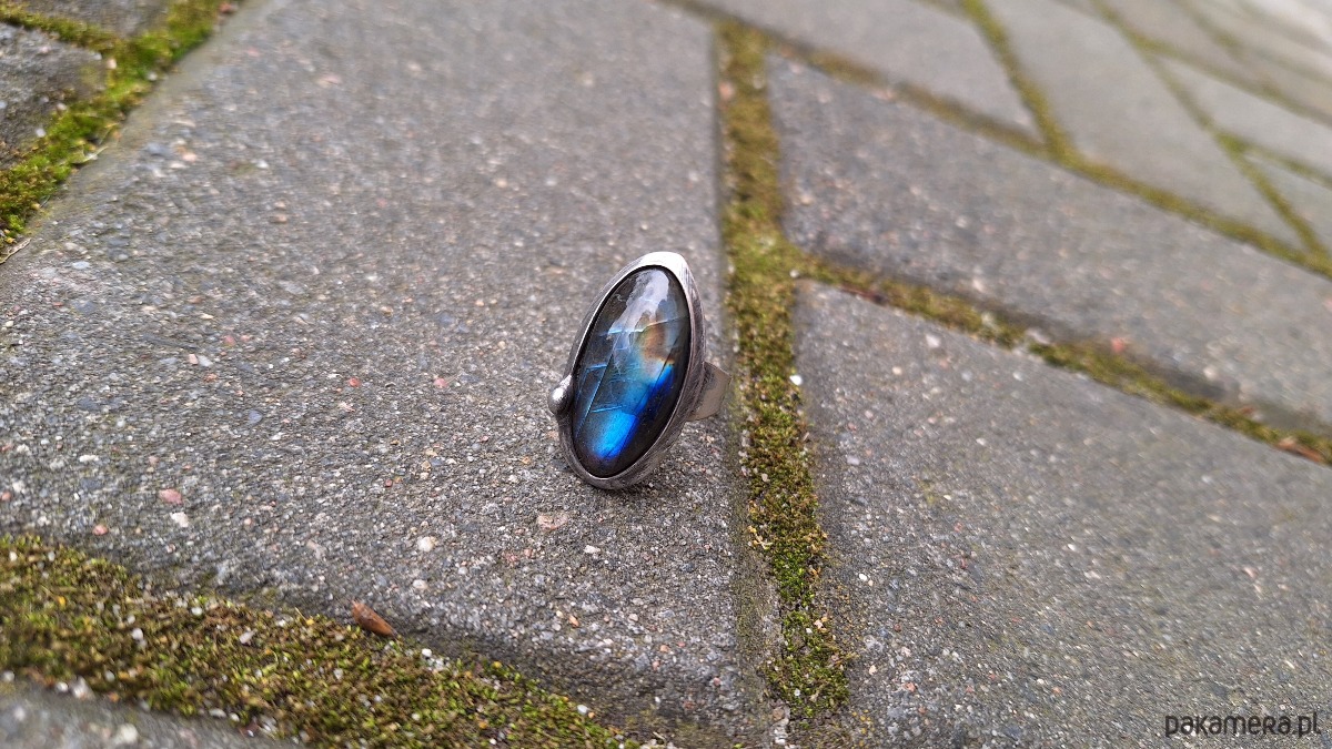 Pierścionek wykonany z miedzi, cyny i labradorytu. Wymiary ok. 2.5 na 1.5 cm. Regulowany. Nie jest ciężki.