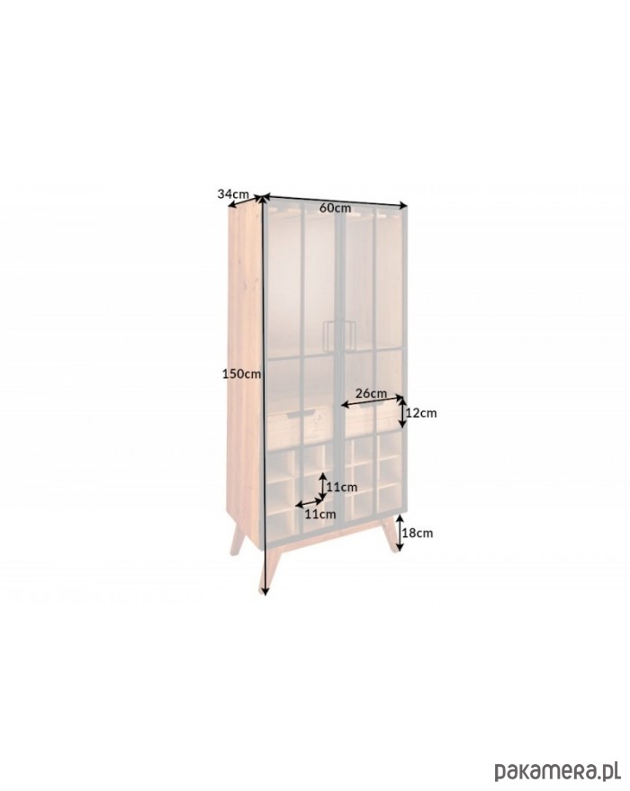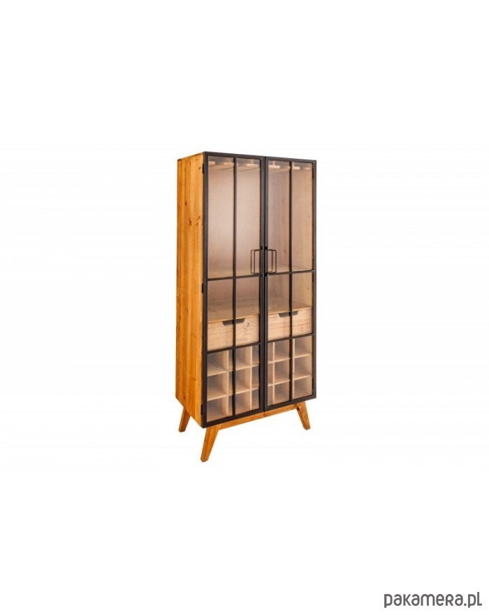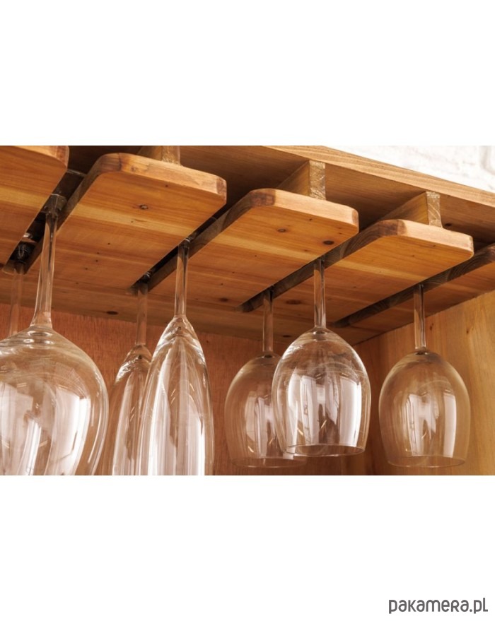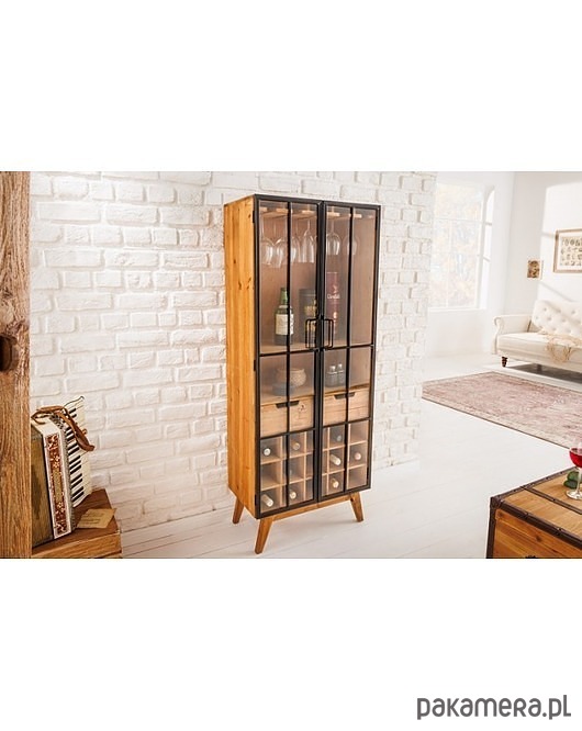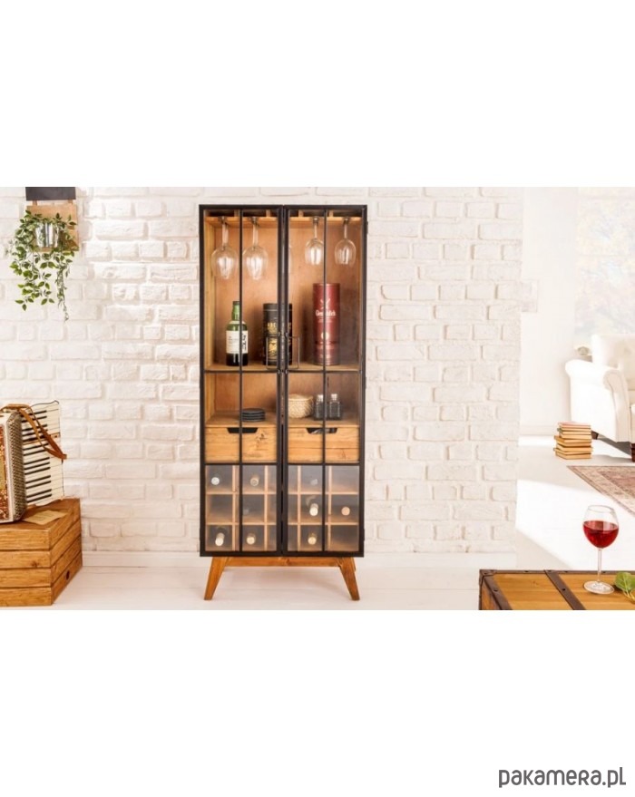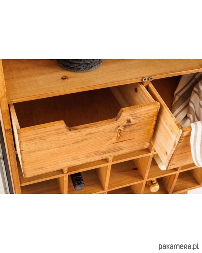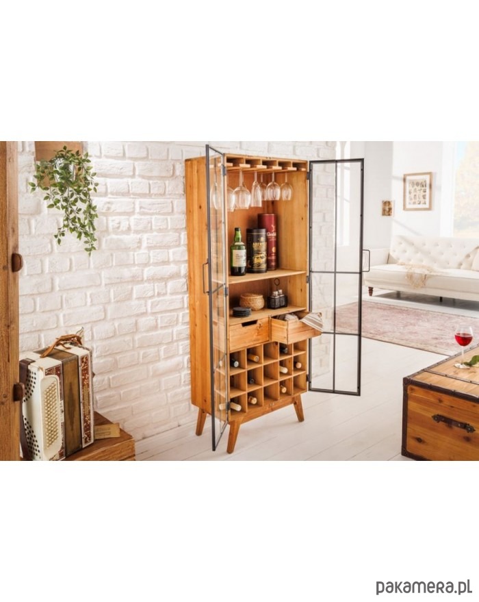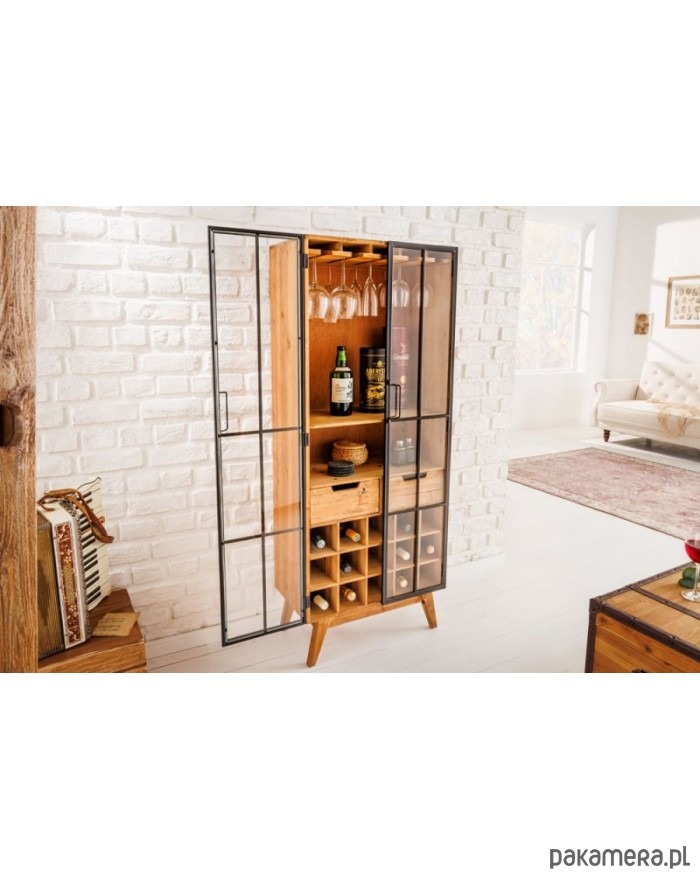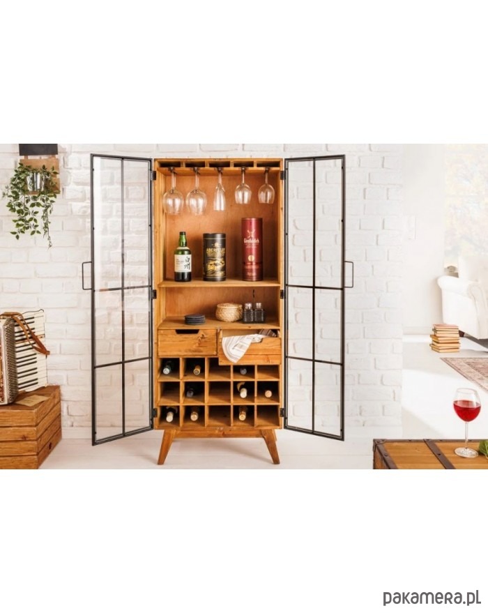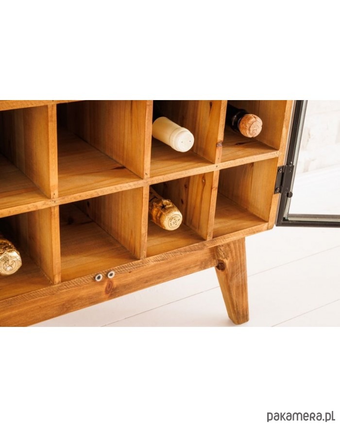 Szafka została wykonana z naturalnego drzewa sosnowego, które uszczelniono i polakierowano. Drzwi są metalowe, czarne, przeszklone. Komoda posiada zawieszki na kieliszki oraz miejsce na butelki, których zmieści maksymalnie 15.