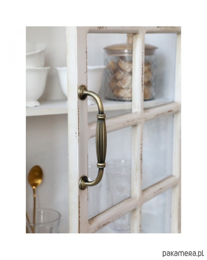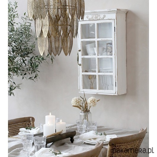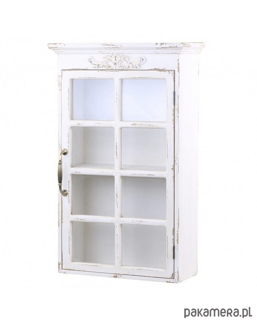 Piękna witrynka przystosowana do powieszenia. Wykonana z drewna jodły oraz sklejki i szkła. W kolorze brudnej bieli. Celowo postarzana.