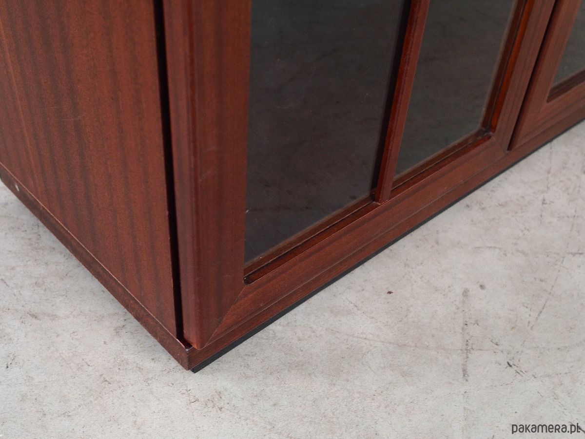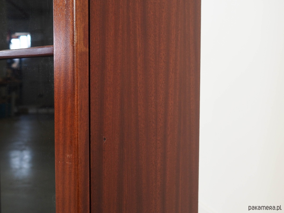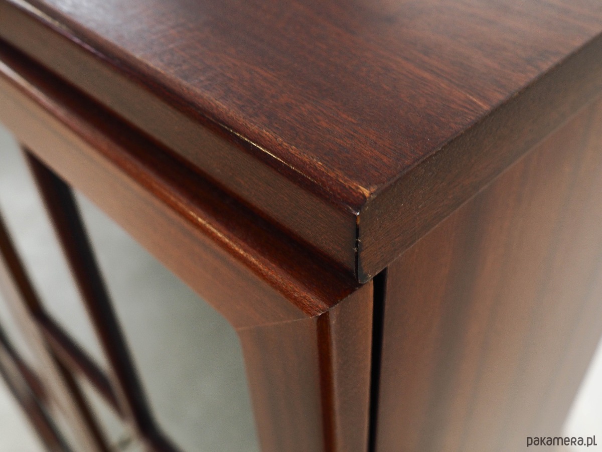 Konstrukcja pokryta jest fornirem mahoniowym. Mebel umieszczony został na drewnianym cokole. Powierzchnia po odświeżeniu. Wewnątrz przestrzeń została wypełniona dwiema praktycznymi półkami z możliwością regulacji wysokości. Witryna z klasycznym rozwiązaniem drzwi otwieranych, dzięki czemu mamy dostęp do całego wnętrza mebla. Klucz w zestawie.