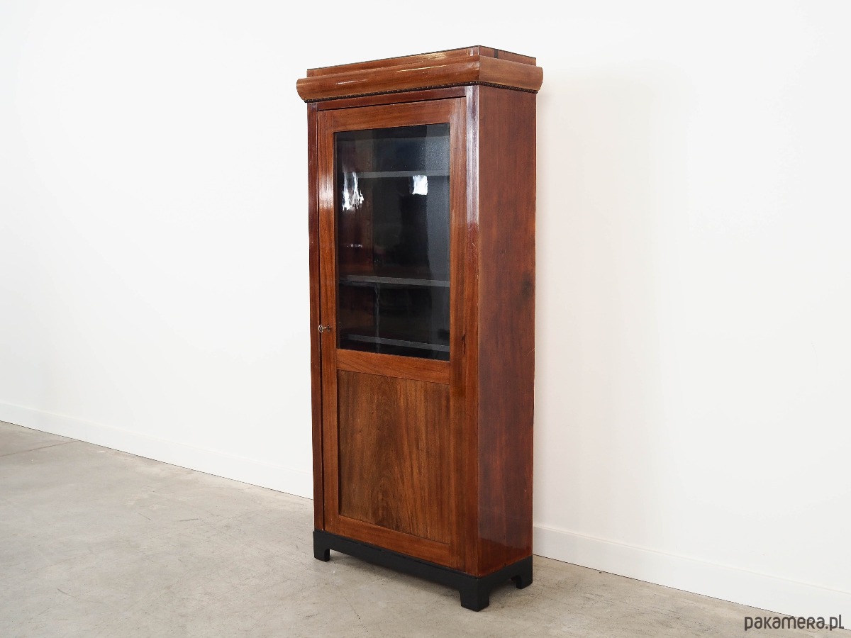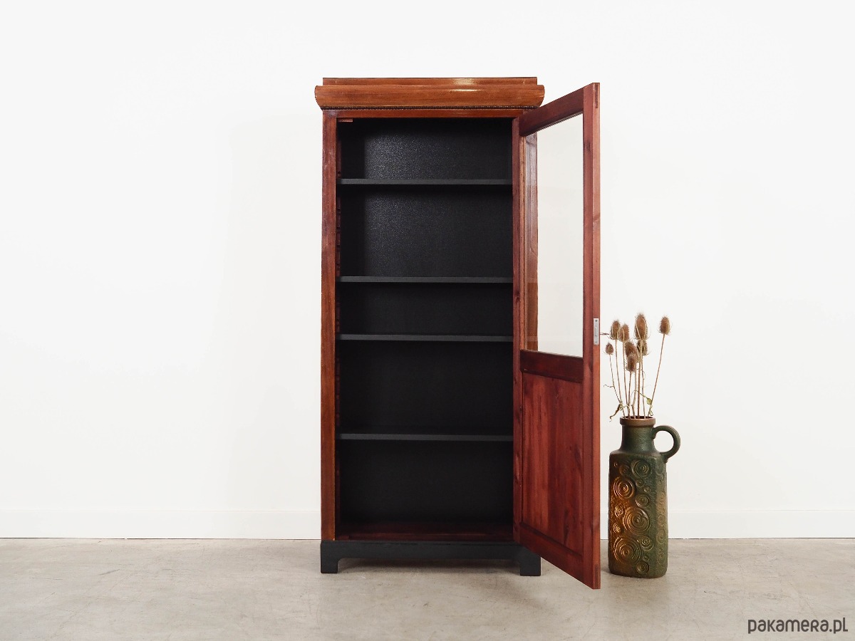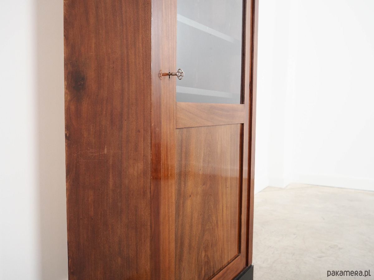 Konstrukcja pokryta jest fornirem orzechowym. Powierzchnia po odświeżeniu. Wewnątrz przestrzeń została wypełniona czterema praktycznymi półkami z możliwością regulacji wysokości. Witryna z klasycznym rozwiązaniem drzwi otwieranych, dzięki czemu mamy swobodny dostęp do wnętrza mebla.