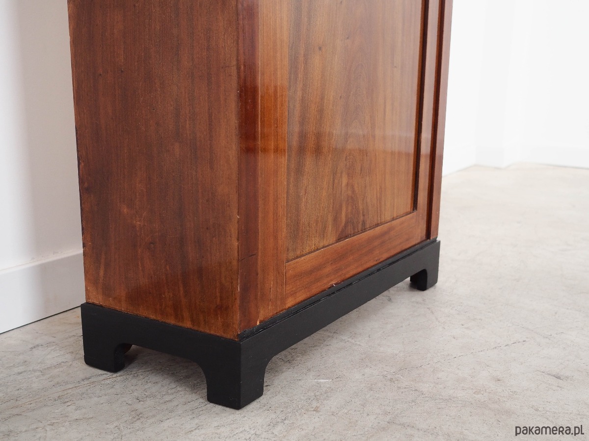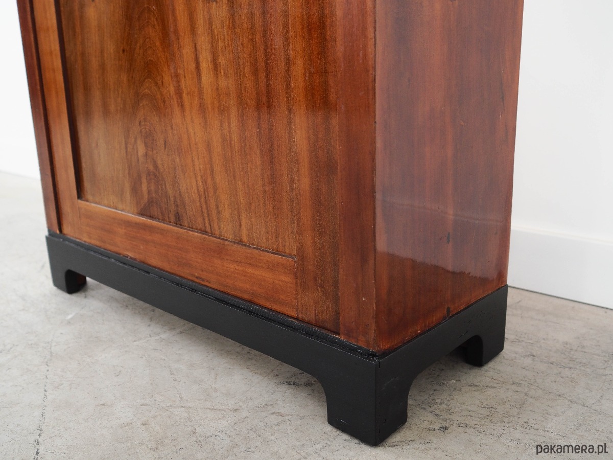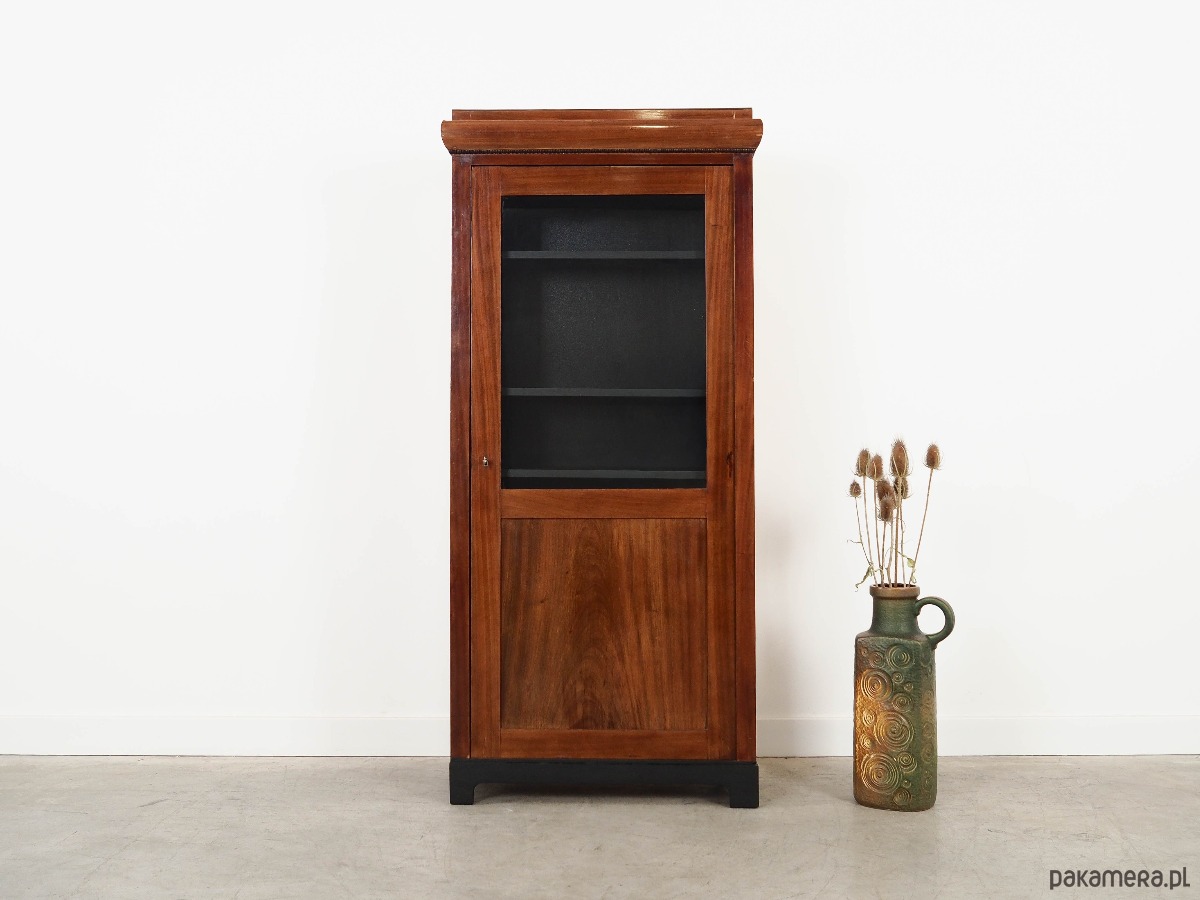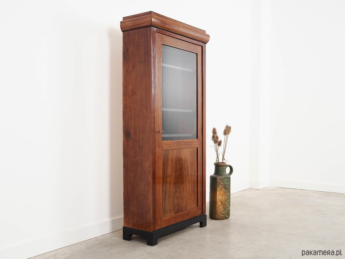 Konstrukcja pokryta jest fornirem orzechowym. Powierzchnia po odświeżeniu. Wewnątrz przestrzeń została wypełniona czterema praktycznymi półkami z możliwością regulacji wysokości. Witryna z klasycznym rozwiązaniem drzwi otwieranych, dzięki czemu mamy swobodny dostęp do wnętrza mebla.