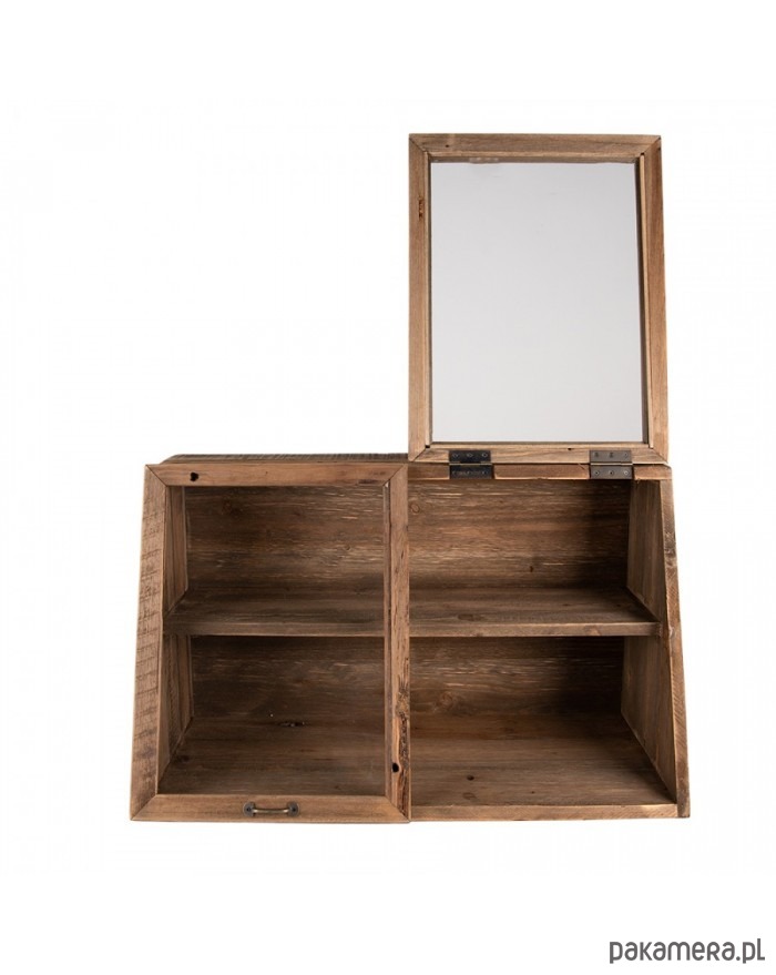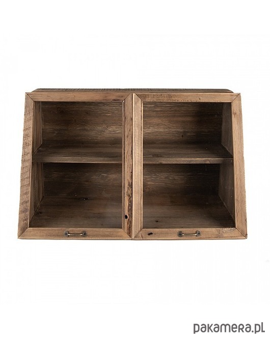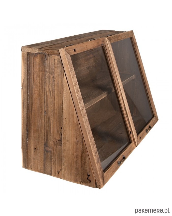 Witrynka wisząca wykonana z drewna w kolorze brązowym. Drzwiczki są przeszklone, otwierane do góry (30x38 cm). Wewnątrz znajdują się dwie półki(58x26 cm). Witryna przeznaczona do postawienia, nie jest przystosowana do powieszenia.