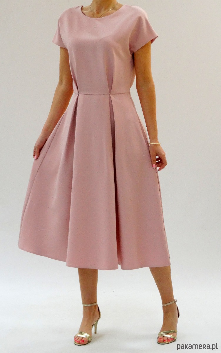 WIZYTOWA SUKIENKA MIDI -kontrafałdy pudrowy róż 34-50