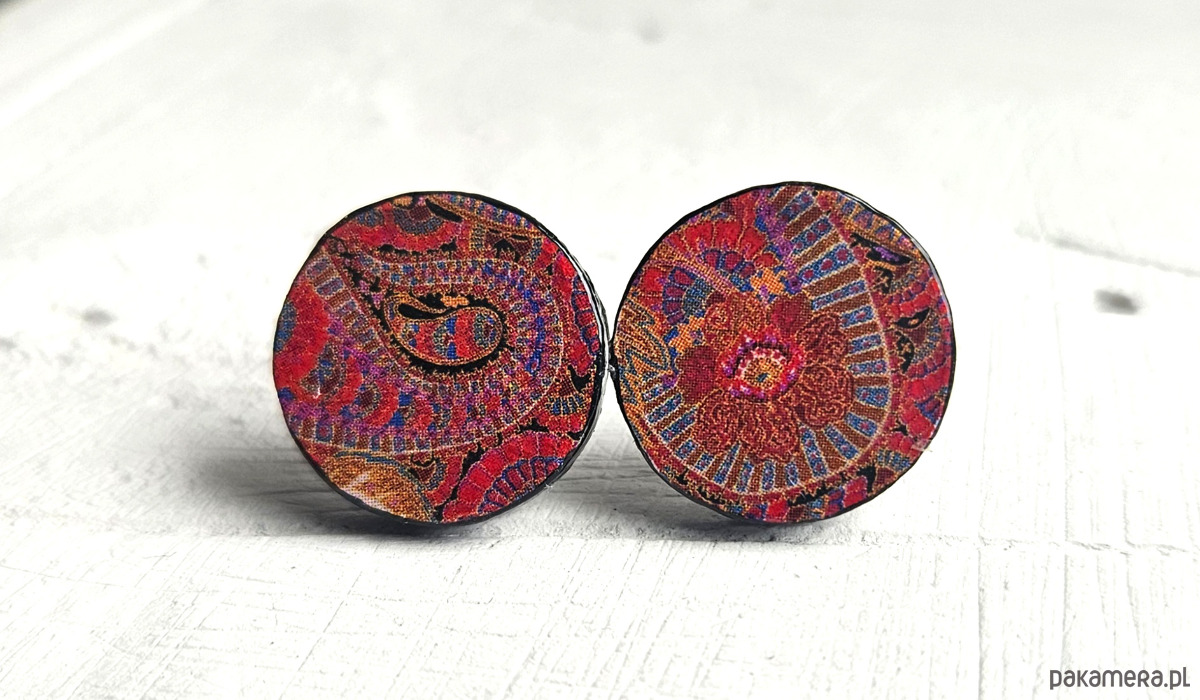 kolczyki drewniane, ozdobione techniką decoupage, starannie wykończone farbami akrylowymi i zabezpieczone wielokrotnie lakierem, sztyfty posrebrzane, średnica: 1,7 cm