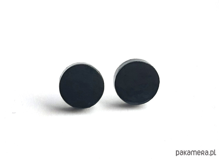 kolczyki drewniane w kolorze czarnym, starannie pomalowane farbami akrylowymi i zabezpieczone wielokrotnie lakierem, sztyfty posrebrzane, średnica: 1,1 cm, bardzo lekkie