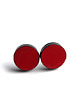 kolczyki drewniane w kolorze czerwonym, boki w czarnym, starannie pomalowane farbami akrylowymi i zabezpieczone wielokrotnie lakierem, sztyfty posrebrzane, średnica: 1,1 cm, bardzo lekkie