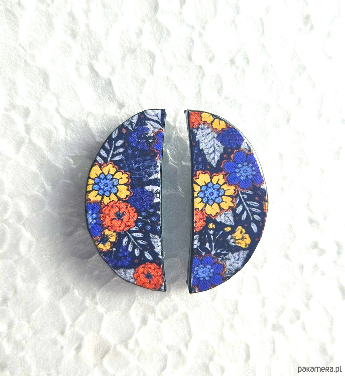 kolczyki drewniane, ozdobione techniką decoupage, starannie wykończone farbami akrylowymi i zabezpieczone wielokrotnie lakierem, sztyfty posrebrzane, rozmiar: 2,5 cm x 1,5 cm
