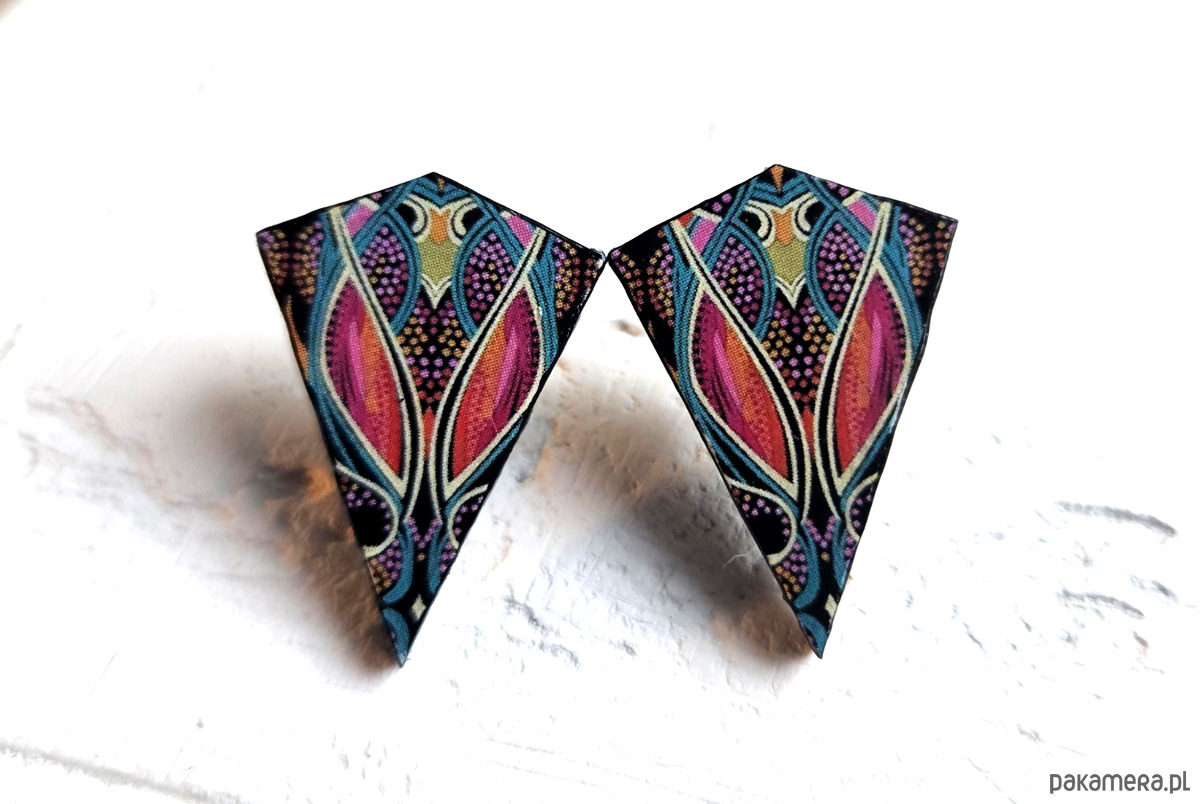 kolczyki drewniane, ozdobione techniką decoupage, starannie wykończone farbami akrylowymi i zabezpieczone wielokrotnie lakierem, sztyfty posrebrzane, długość: 3 cm, szerokość: 2 cm