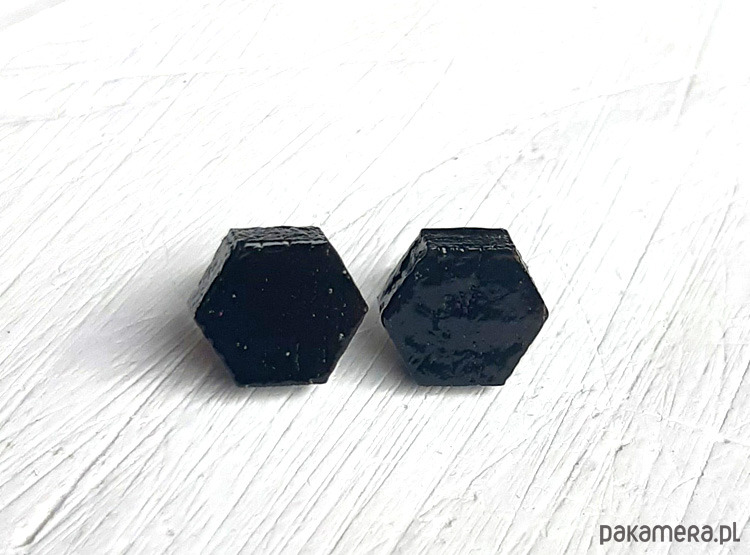 kolczyki drewniane w kolorze czarnym, starannie pomalowane farbami akrylowymi i zabezpieczone wielokrotnie lakierem, sztyfty posrebrzane, średnica: 1,1 cm, bardzo lekkie