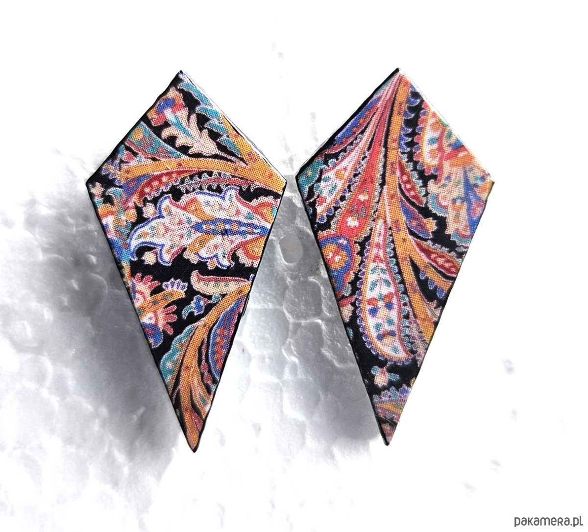 kolczyki drewniane, ozdobione techniką decoupage, starannie wykończone farbami akrylowymi i zabezpieczone wielokrotnie lakierem, sztyfty posrebrzane, długość: 3 cm, szerokość: 2 cm