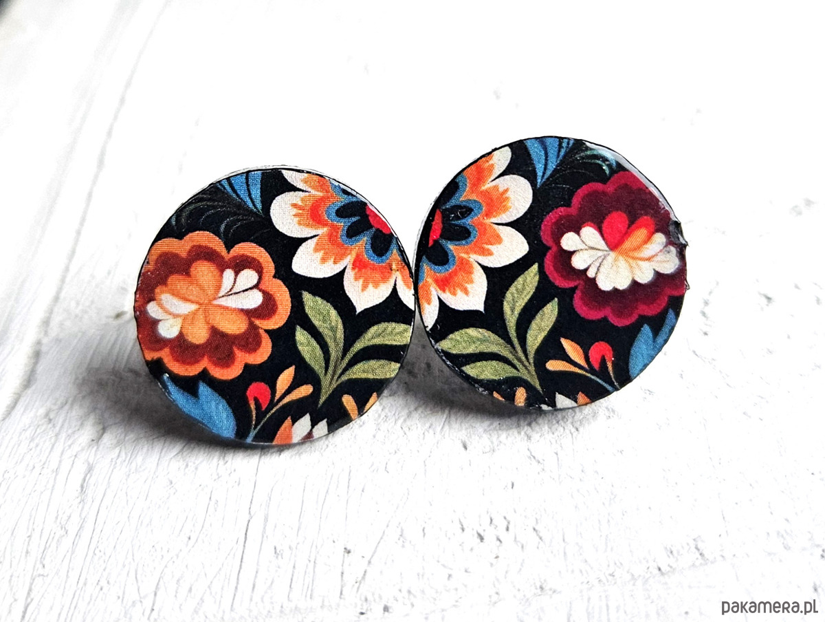 kolczyki drewniane, ozdobione techniką decoupage, starannie wykończone farbami akrylowymi i zabezpieczone wielokrotnie lakierem, sztyfty posrebrzane, średnica: 2 cm