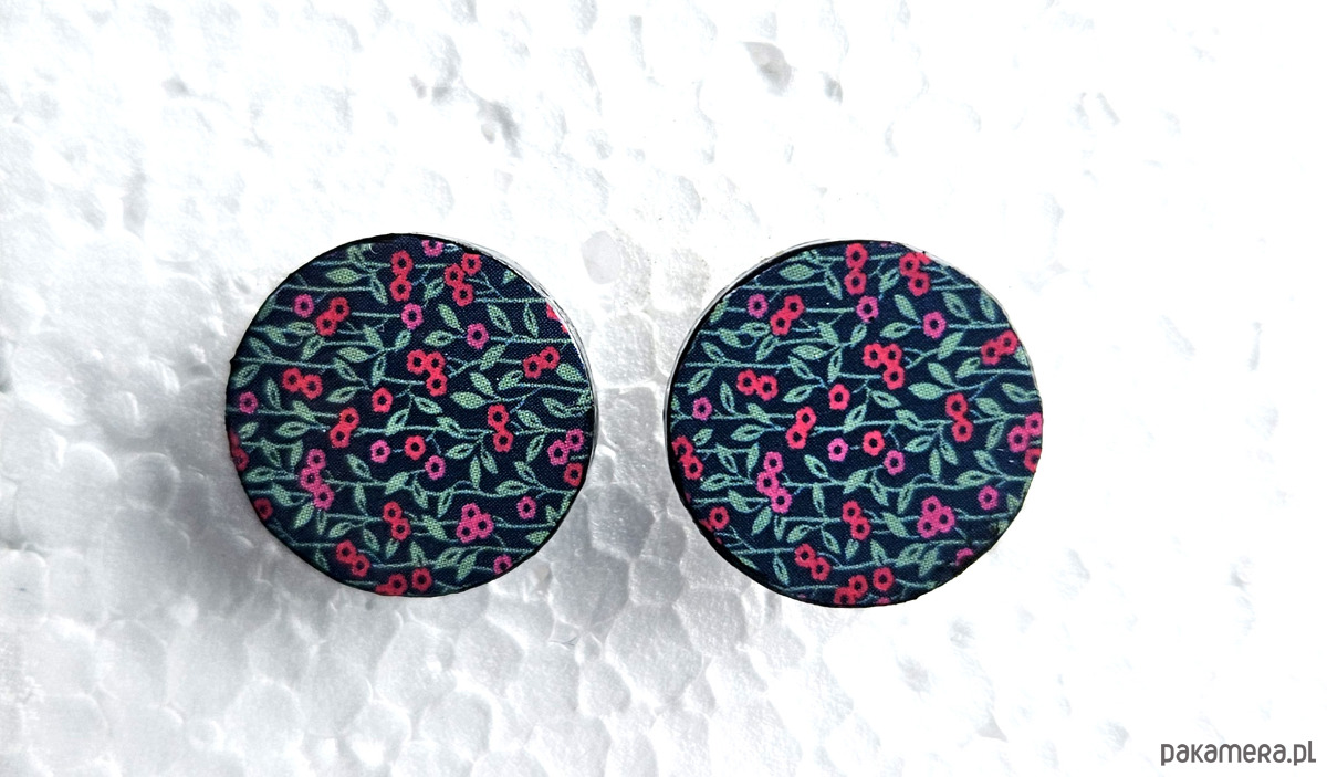 kolczyki drewniane, ozdobione techniką decoupage, starannie wykończone farbami akrylowymi i zabezpieczone wielokrotnie lakierem, sztyfty posrebrzane, średnica: 2 cm