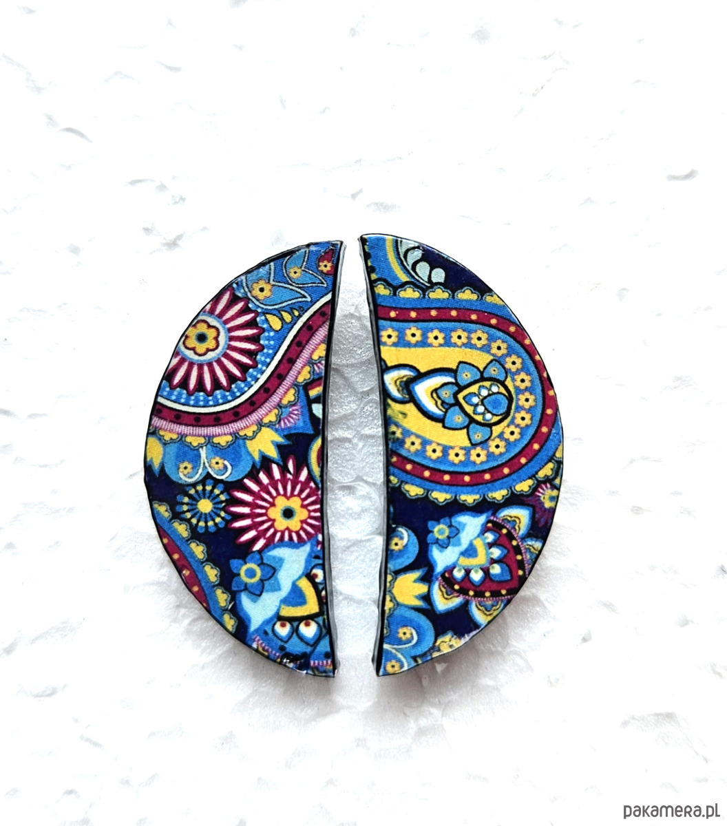kolczyki drewniane, ozdobione techniką decoupage, starannie wykończone farbami akrylowymi i zabezpieczone wielokrotnie lakierem, sztyfty posrebrzane, rozmiar: 3,2 cm x 1,3 cm