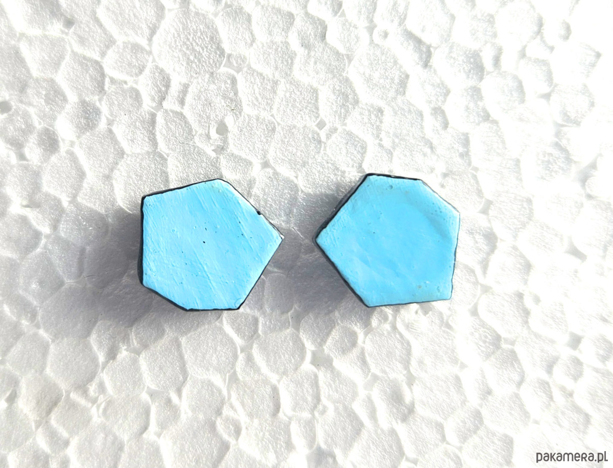 kolczyki drewniane, starannie pomalowane farbami akrylowymi i zabezpieczone wielokrotnie lakierem, sztyfty posrebrzane, średnica: 1,3 cm, bardzo lekkie