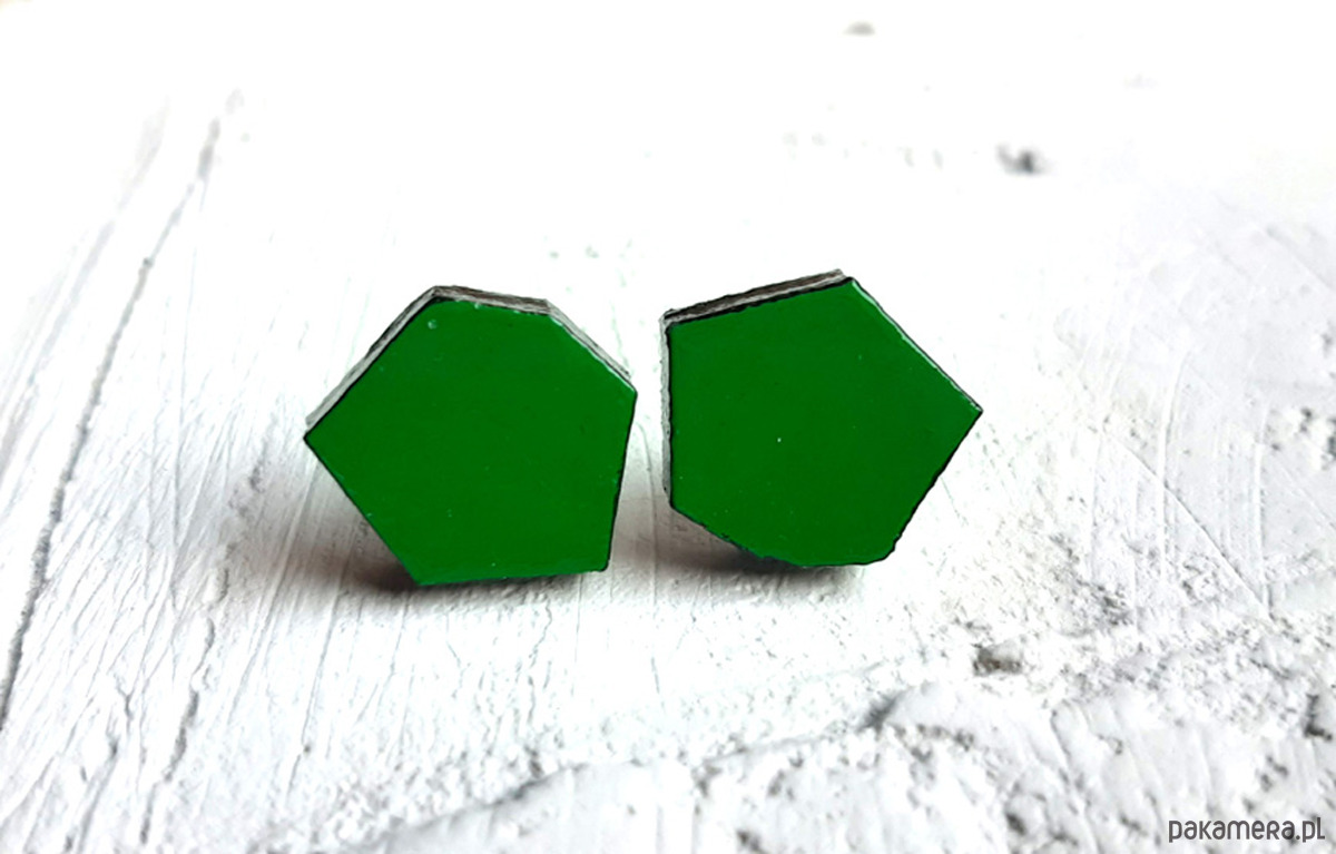kolczyki drewniane, starannie pomalowane farbami akrylowymi i zabezpieczone wielokrotnie lakierem, sztyfty posrebrzane, średnica: 1,3 cm, bardzo lekkie