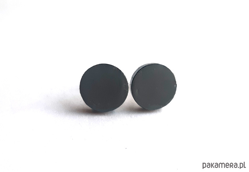 kolczyki drewniane w kolorze szarym, starannie pomalowane farbami akrylowymi i zabezpieczone wielokrotnie lakierem, sztyfty posrebrzane, średnica: 1,1 cm, bardzo lekkie