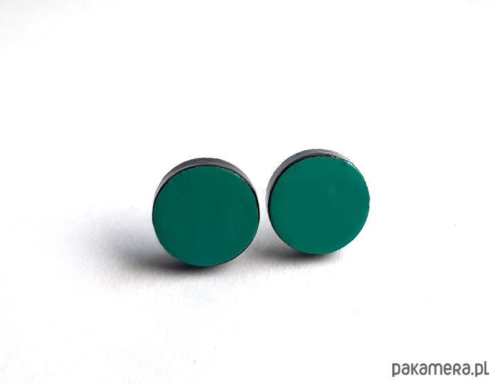 kolczyki drewniane w kolorze turkusowym, boki w czarnym, starannie pomalowane farbami akrylowymi i zabezpieczone wielokrotnie lakierem, sztyfty posrebrzane, średnica: 1,1 cm, bardzo lekkie