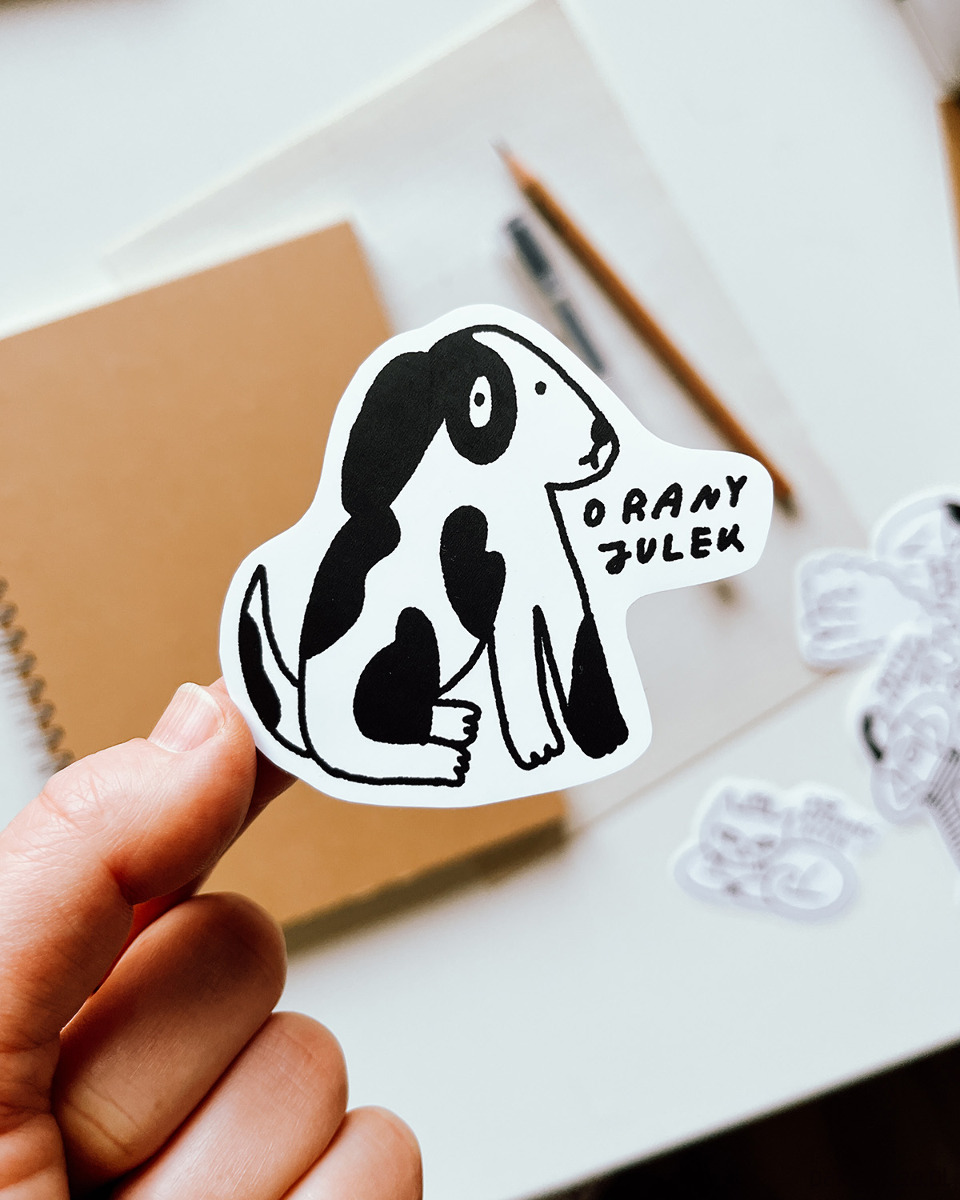 Wlepka z pieskiem dla zdziwionych niespodziewanym obrotem spraw albo innymi dziwami tego świata! No i po prostu dla psiarzy, bo z pieskami wszystko jest fajne. Można użyć jako naklejka na laptop, telefon, rower, gdziekolwiek, gdzie będzie cieszyć oczy. No albo dać w prezencie. Rany, jedna mała wlepka, a tyle możliwości.