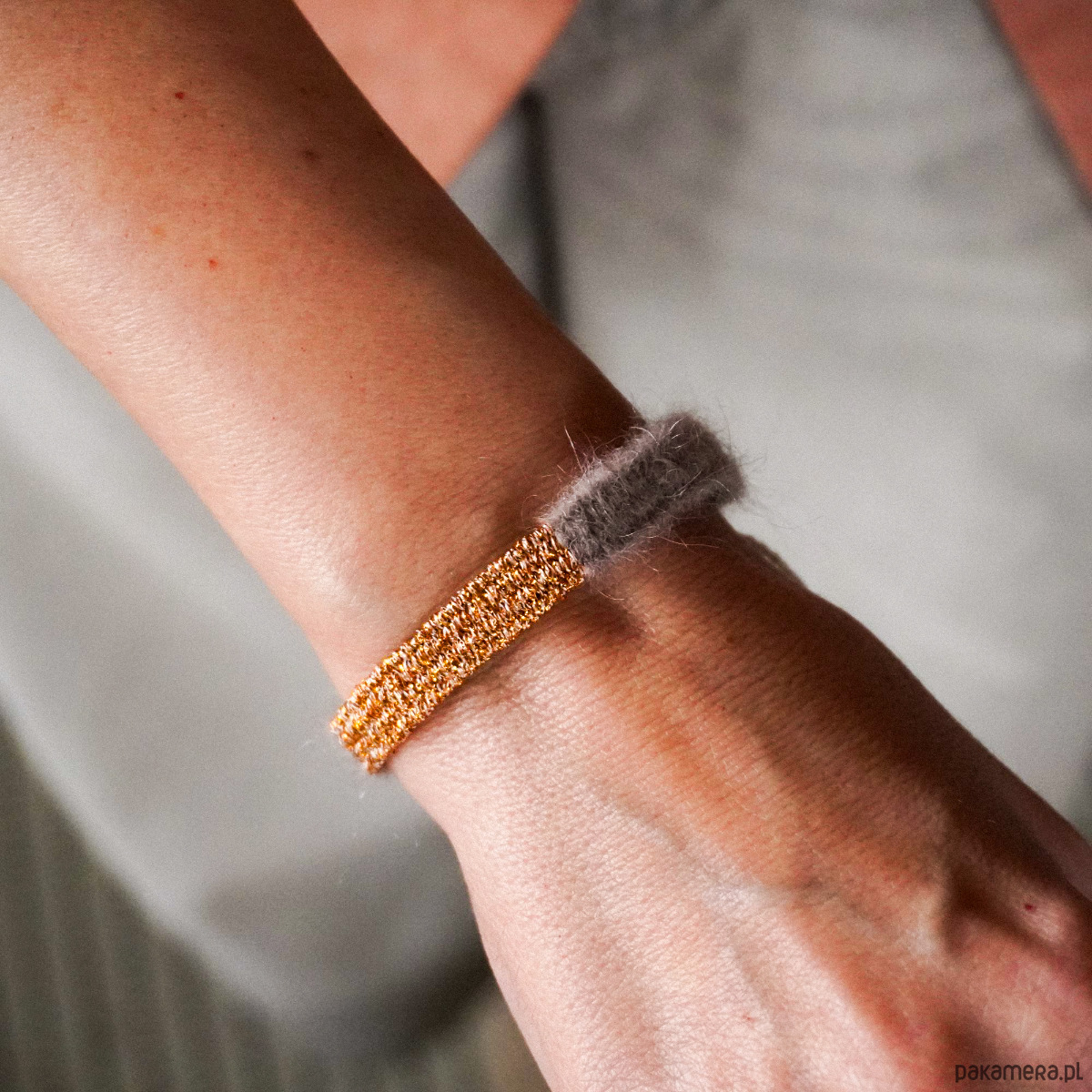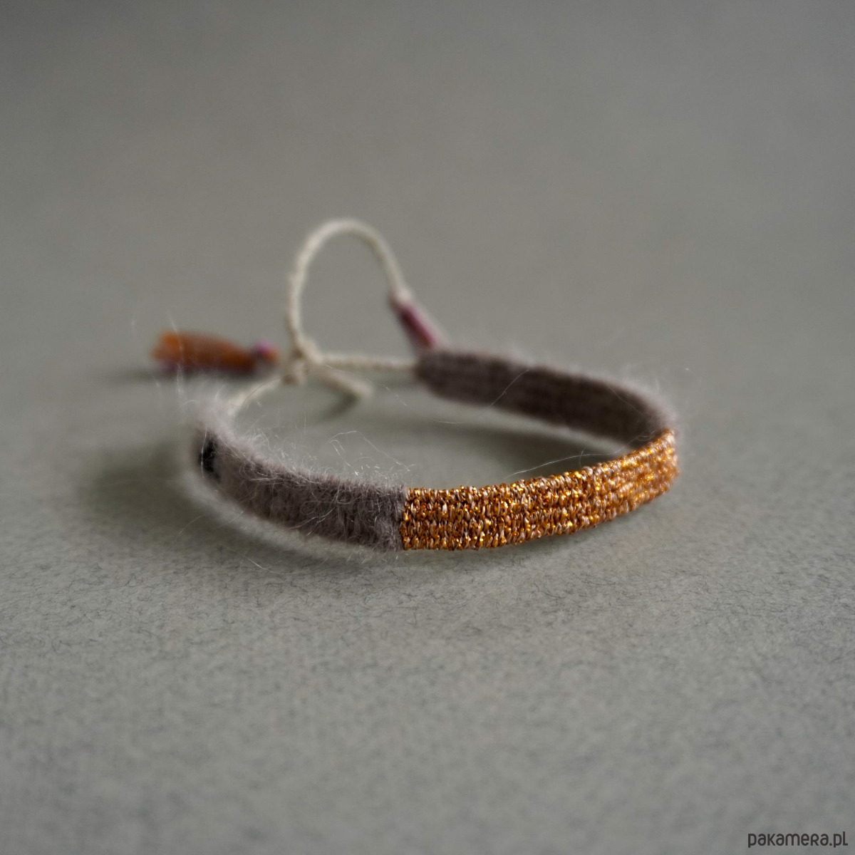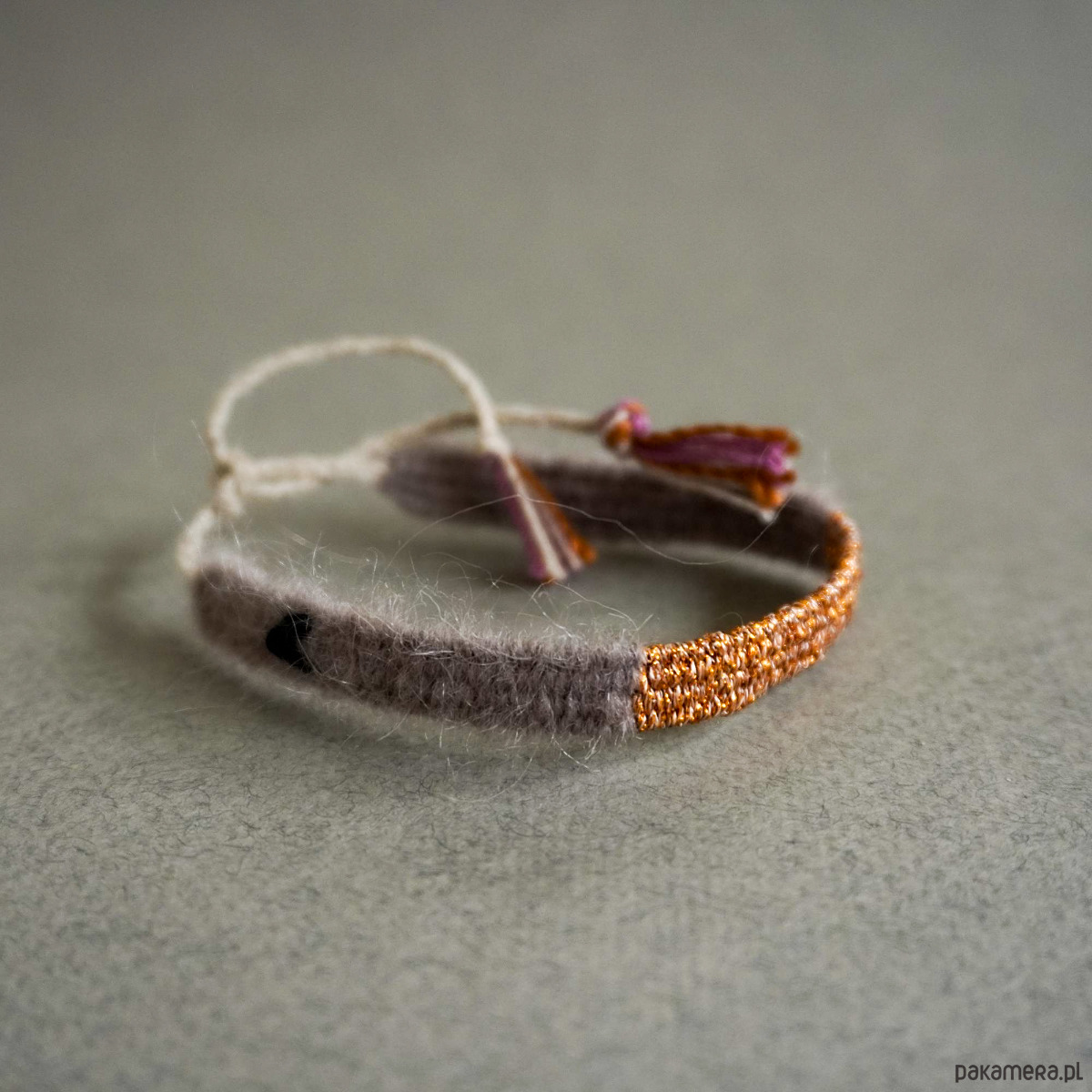 Śliczna bransoletka tkana na krośnie. Kolorystyka to zimny beż/szary, miedziane złoto i czarne serduszko. Różnorodność faktur, haftowane serduszko.