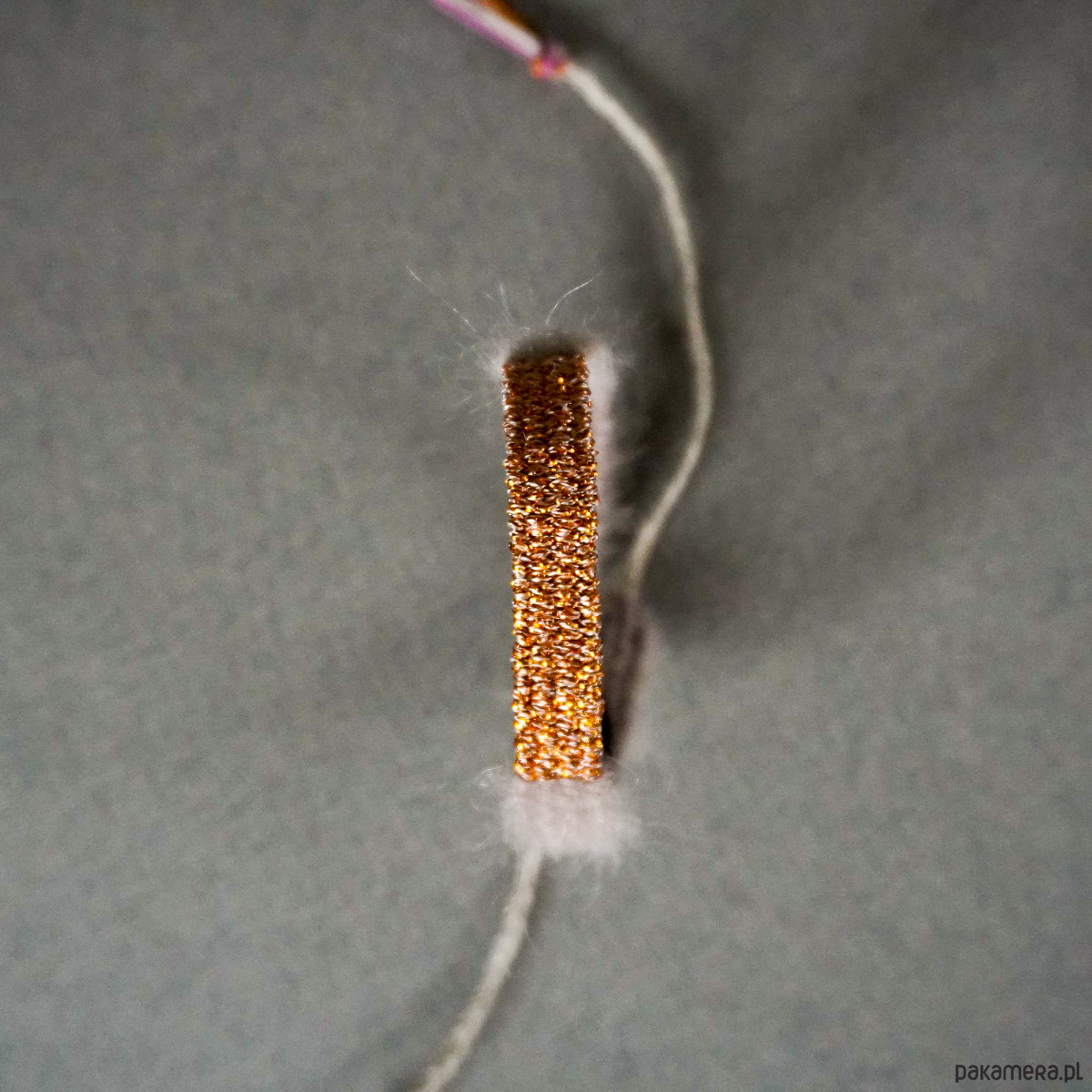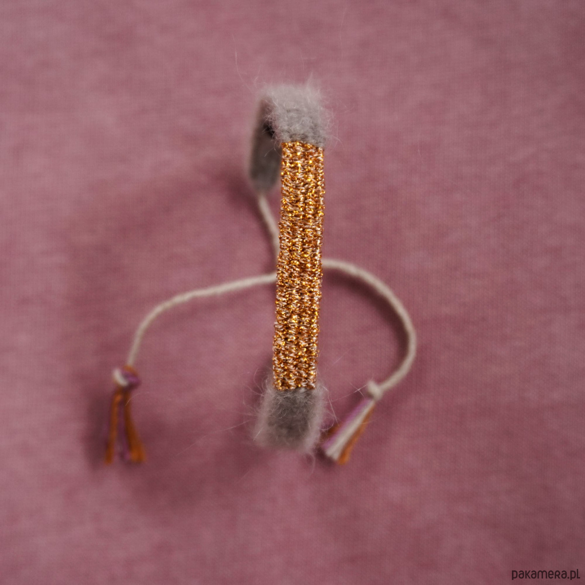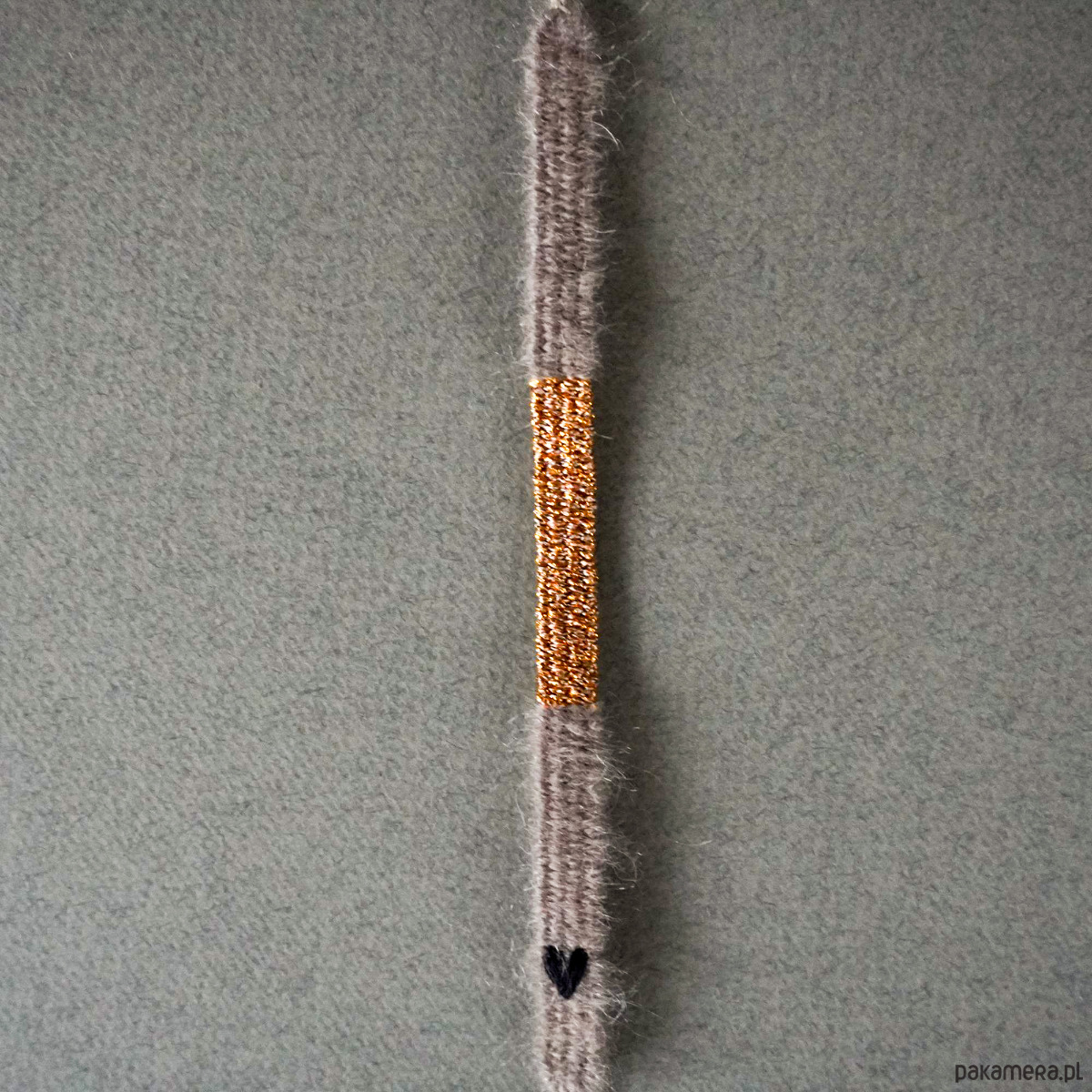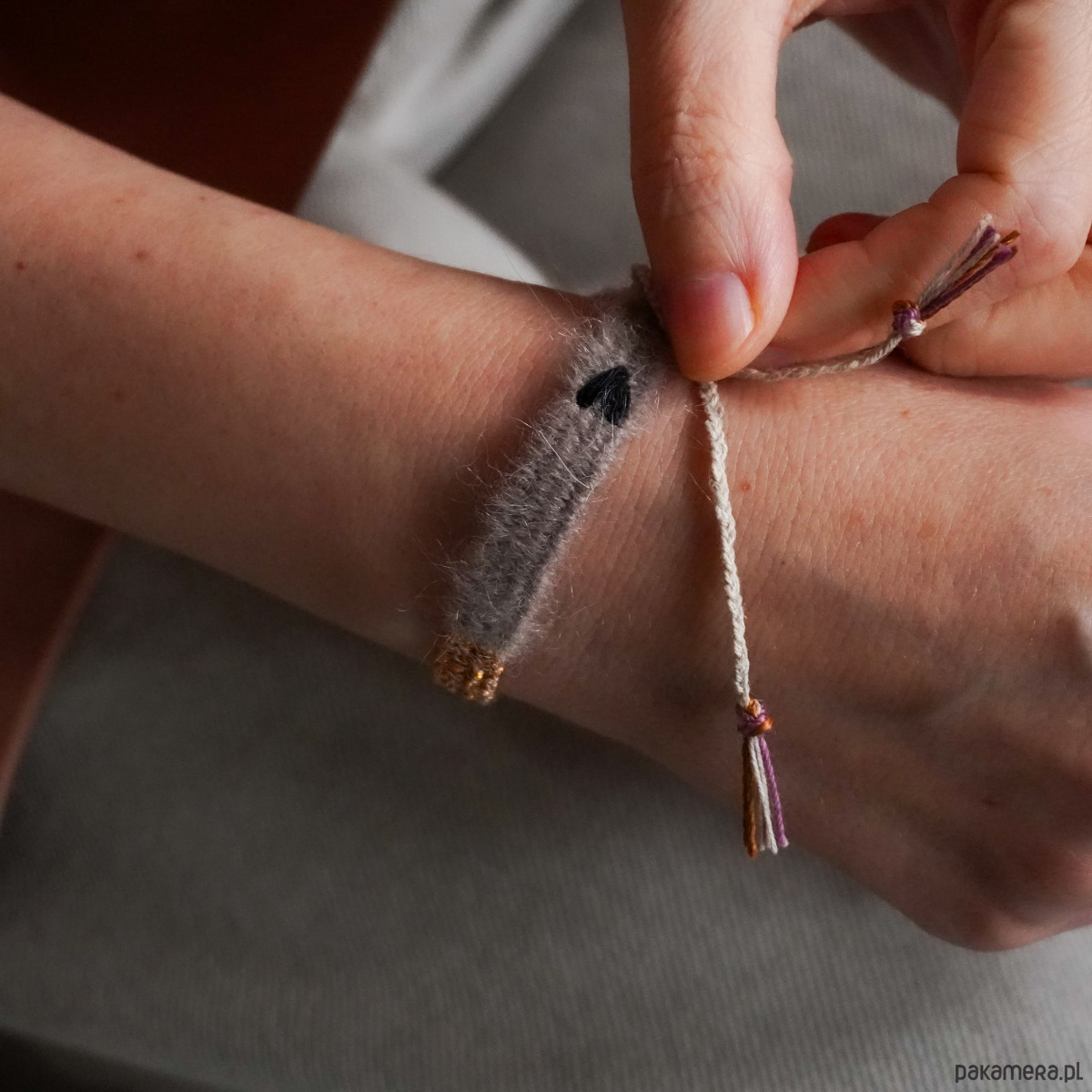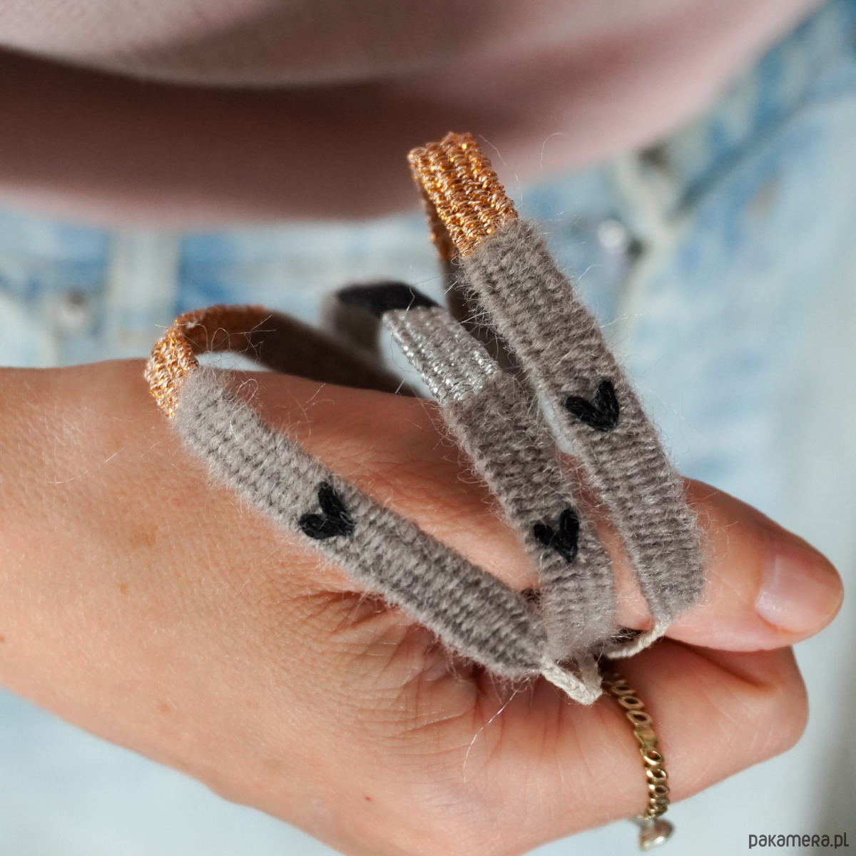 Włóczkowa bransoletka z błyszczącym środkiem i haftowanym serduszkiem