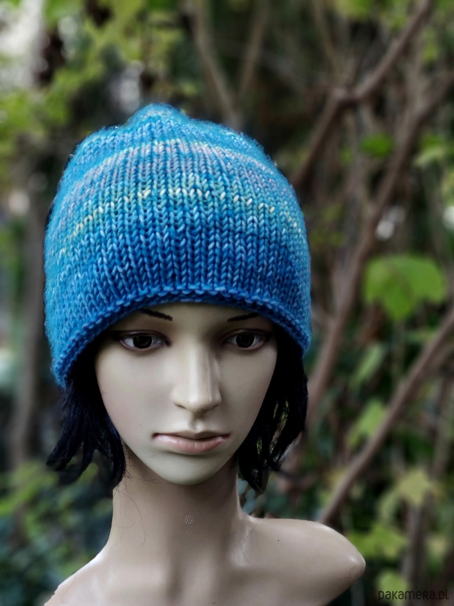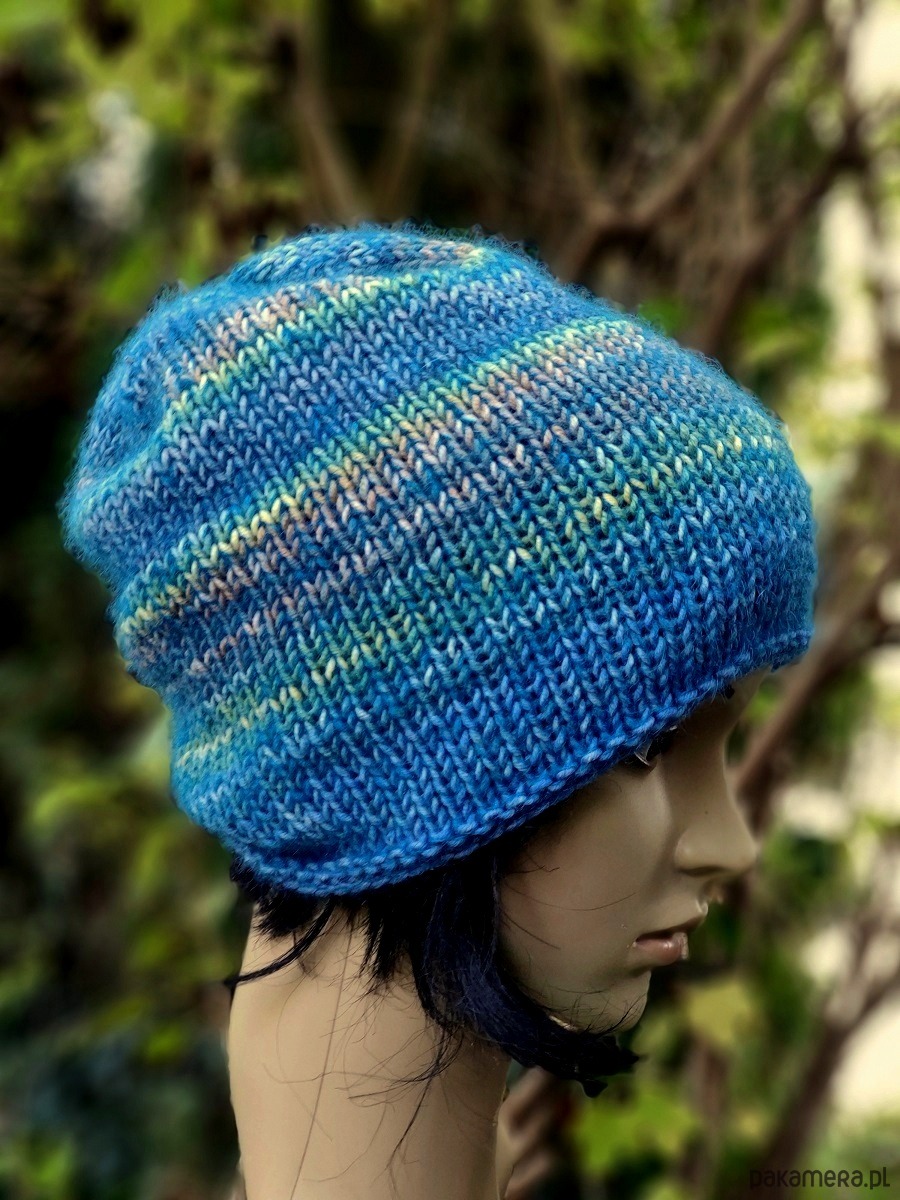 Ciepła, mięsista, miękka i cudowna w dotyku czapka wykonana ręcznie na drutach. Połączyłam cieniutką nitkę 75% kid moher/25% jedwab z włóczka o sprężystym skręcie (100% merino). Czapka bezszwowa, lejąca.