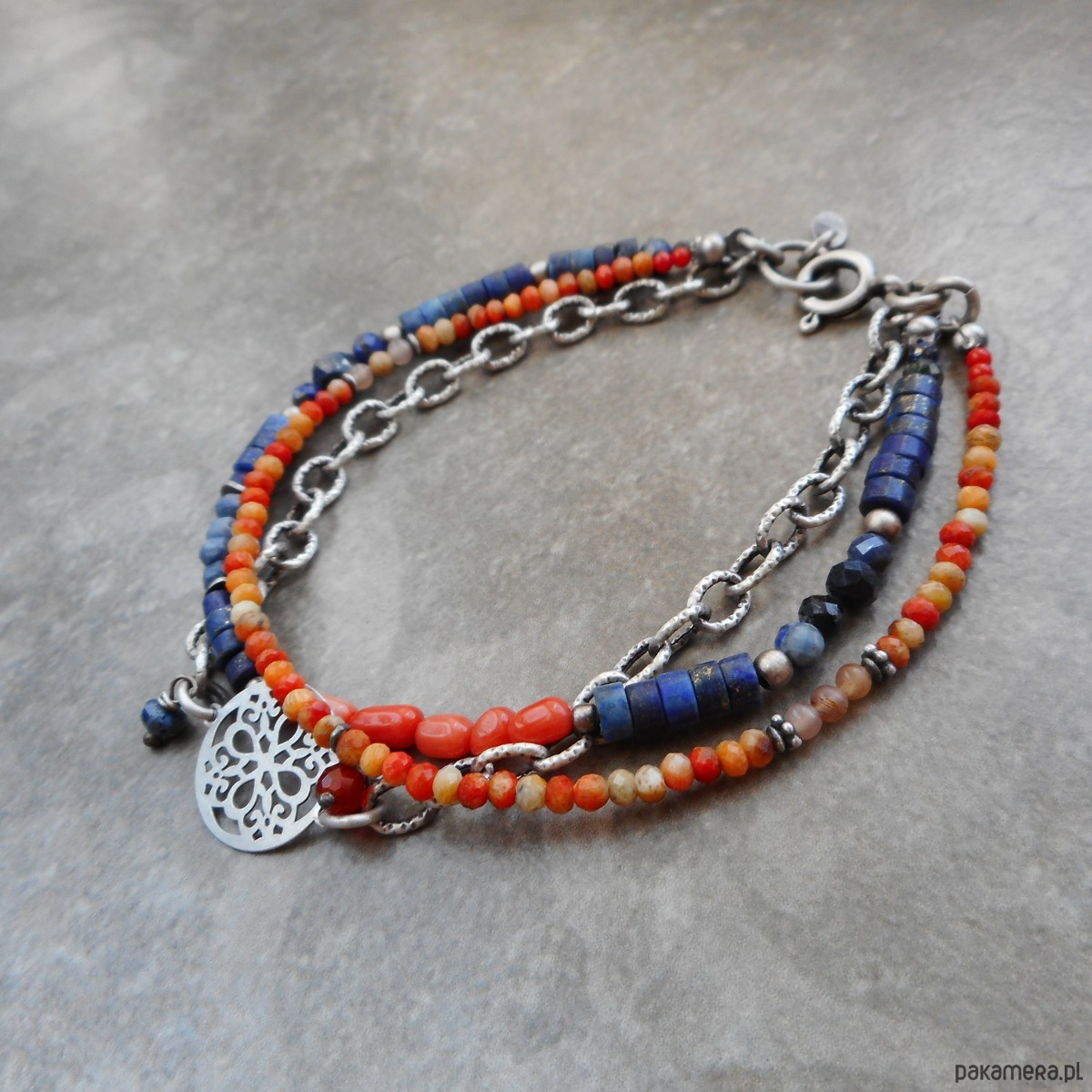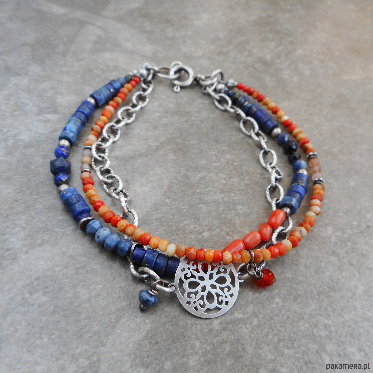 Efektowna bransoletka z kamieni naturalnych i szlachetnego srebra; drobne kamienie w odcieniach niebieskiego i pomarańczu z solidnym łańcuszkiem tworzą kompozycję w nieco surowym stylu.
