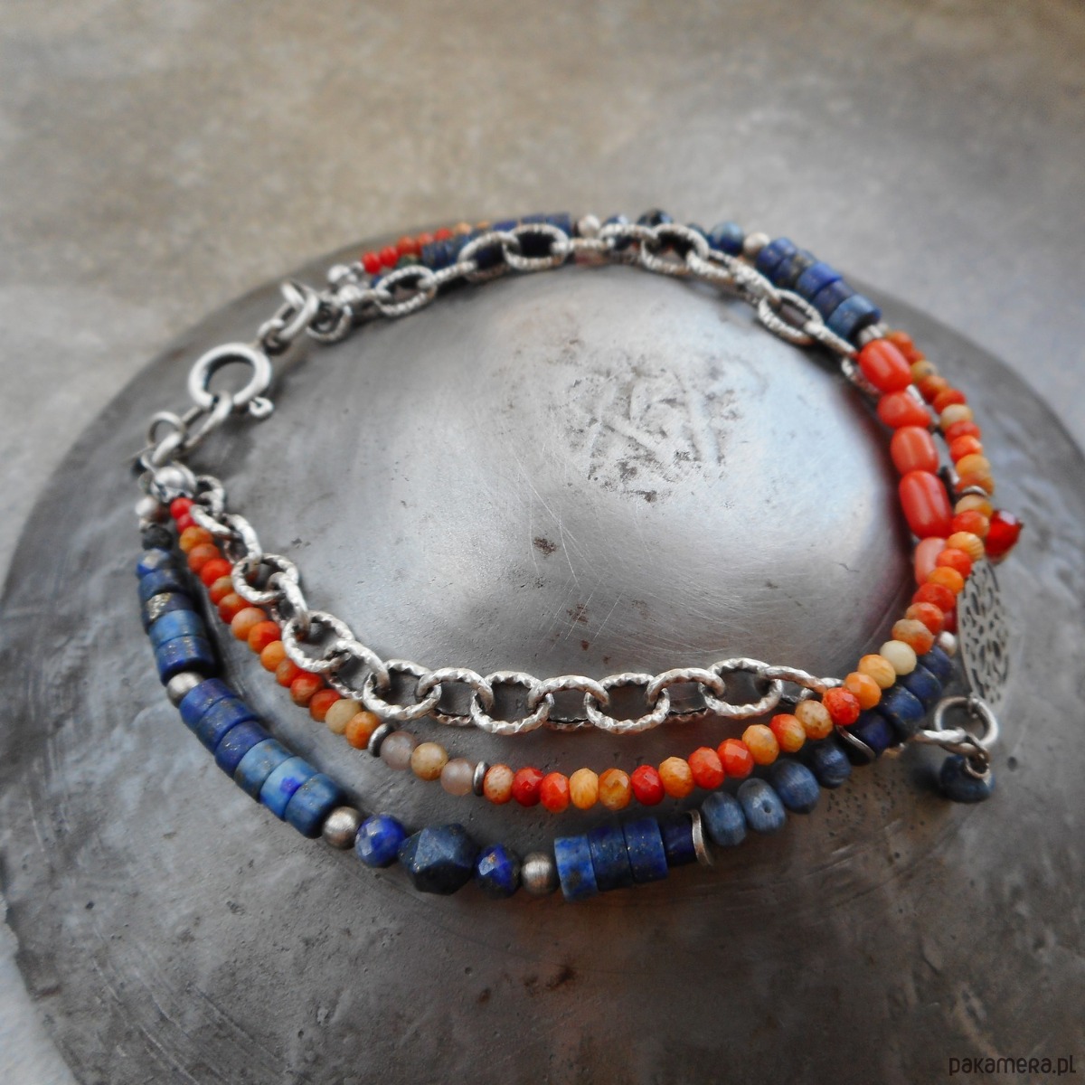 Efektowna bransoletka z kamieni naturalnych i szlachetnego srebra; drobne kamienie w odcieniach niebieskiego i pomarańczu z solidnym łańcuszkiem tworzą kompozycję w nieco surowym stylu.