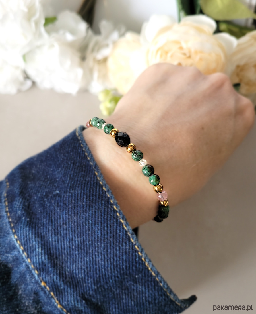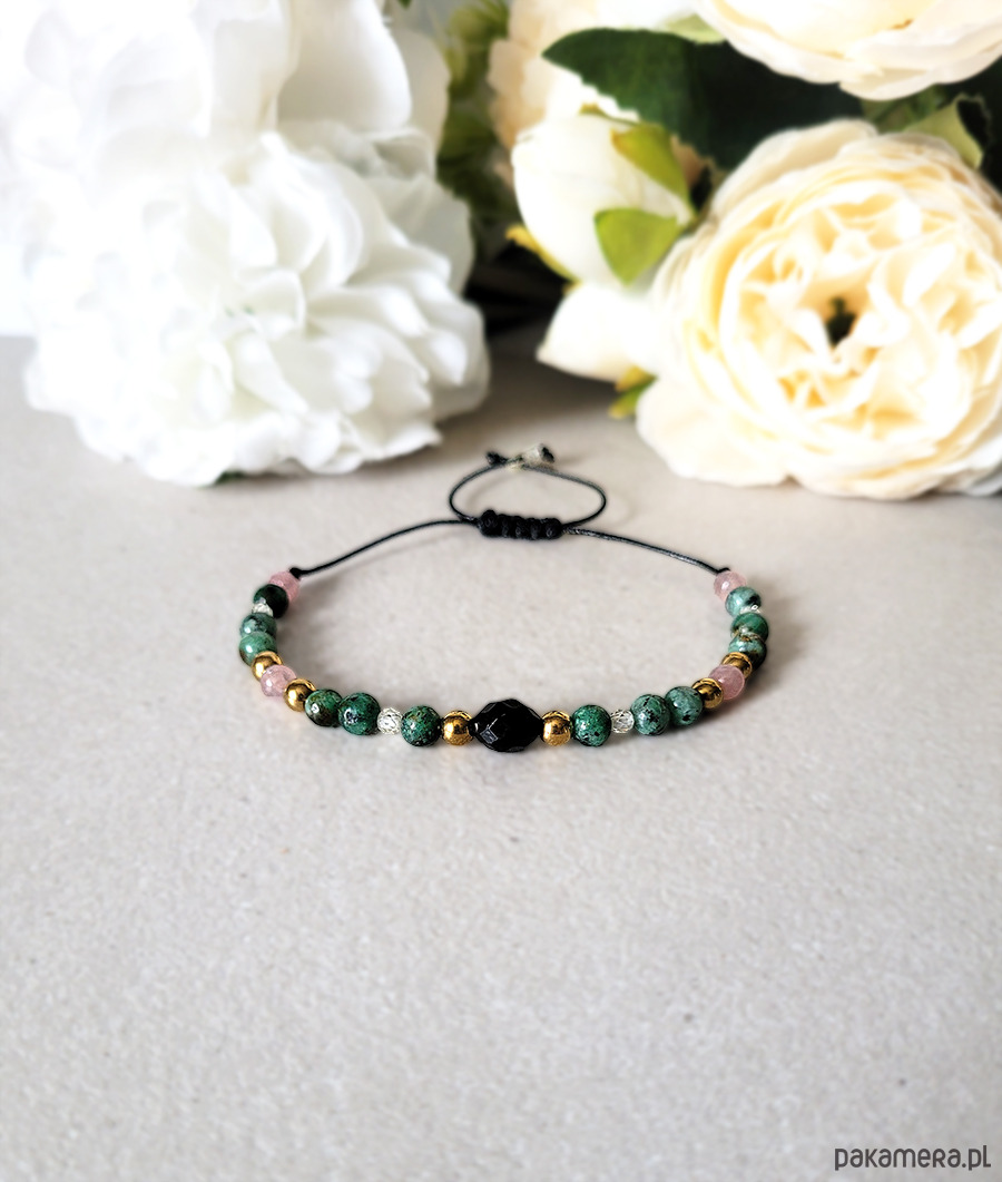 Bransoletka zrobiona z kamieni naturalnych: Turmalinu, Turkusu afrykańskiego, Opalu różowego, Hematytu i Cyrkonii głównie przeznaczona dla zodiakalnego Wodnika.