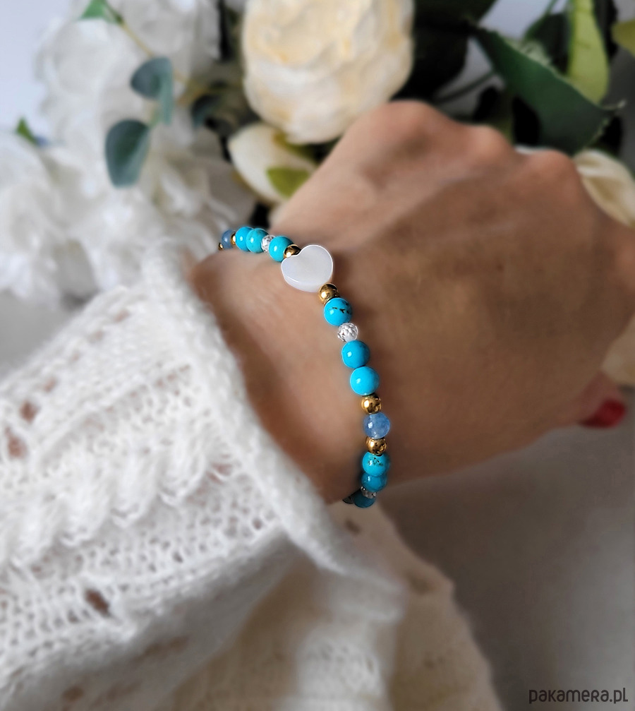 Bransoletka zrobiona z kamieni naturalnych: Howlitu, Masy perłowej, Akwamarynu, Hematytu w kolorze złota oraz Cyrkonii głównie przeznaczona dla zodiakalnego Wodnika.