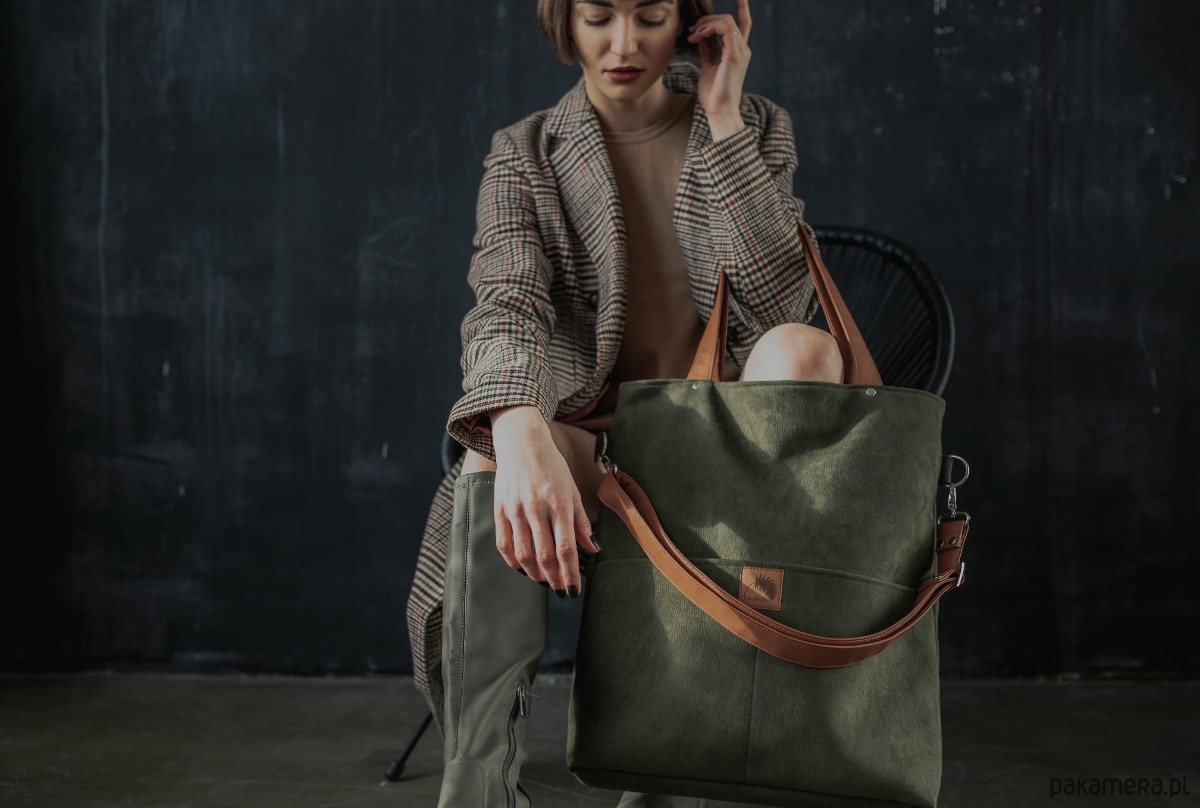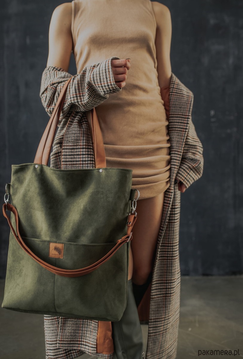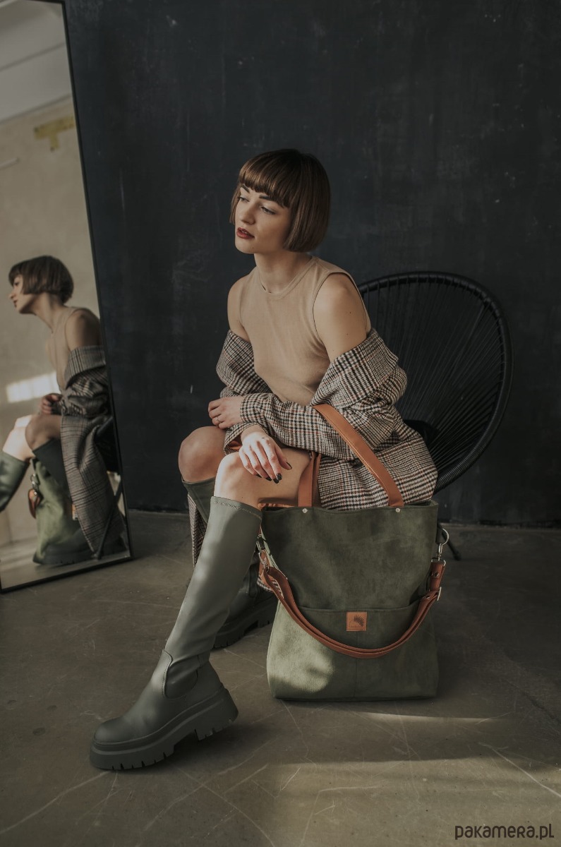 Materiał wierzchni: fantastycznej jakości gruby włoski zamsz ekologiczny typu Bukara. Łatwy w utrzymaniu czystości, wytrzymały na ścieranie. Rączki i długi pasek skóra ekologiczna, brązowa.