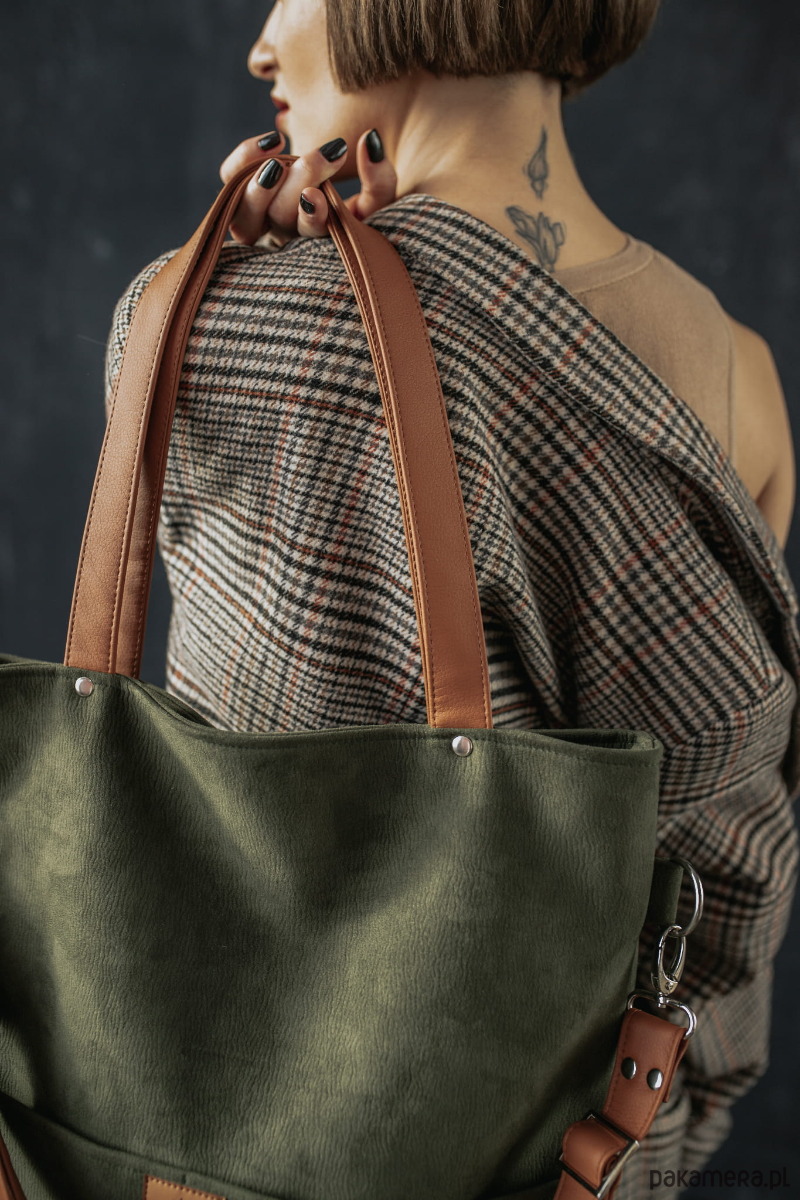 Materiał wierzchni: fantastycznej jakości gruby włoski zamsz ekologiczny typu Bukara. Łatwy w utrzymaniu czystości, wytrzymały na ścieranie. Rączki i długi pasek skóra ekologiczna, brązowa.