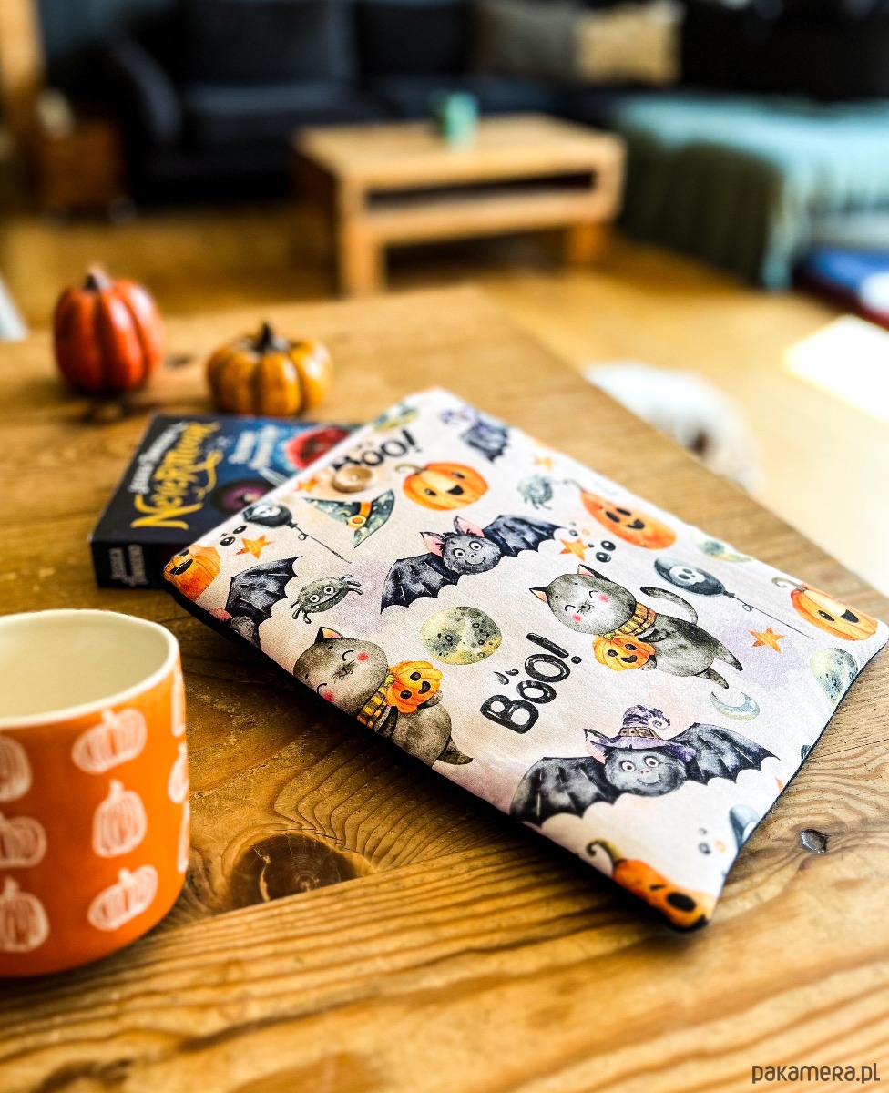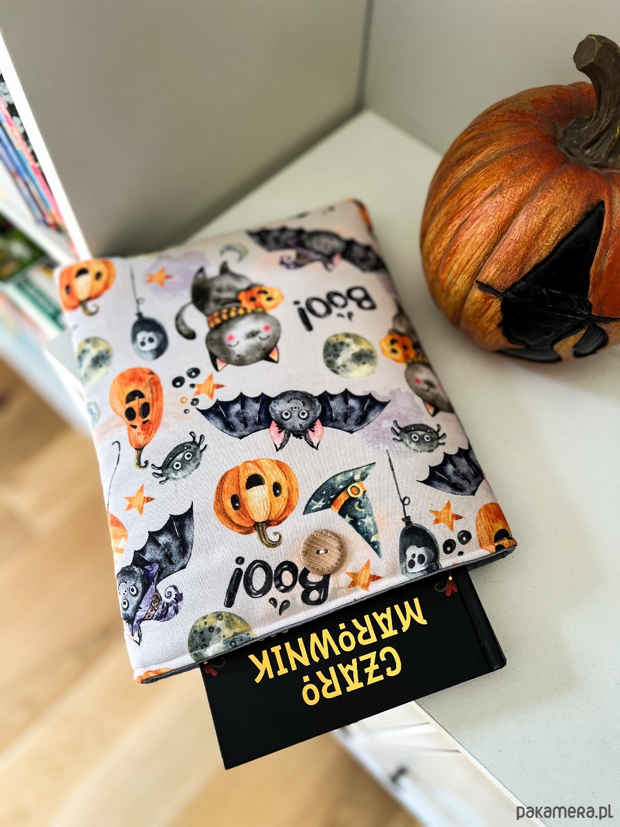 Zapinany na guzik z elastyczną gumką, świetnie trzyma zawartość w środku. Wzór z motywem Halloween – dynie, koty i nietoperze – wprowadza wyjątkowy klimat jesiennych wieczorów z książką. To także świetny pomysł na prezent dla moli książkowych i fanów jesiennej magii.