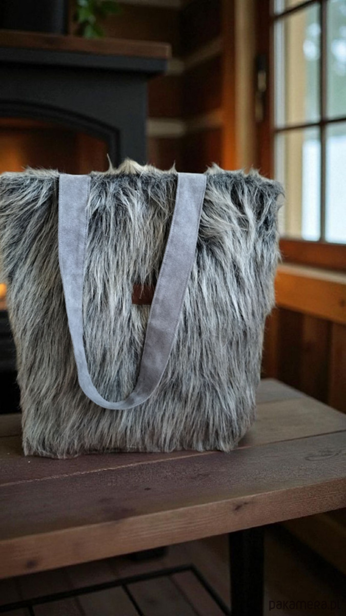 Torba na ramię z szarego, sztucznego futerka, w kolorze podobnym do wilka. Długi włos, torba miła w dotyku.