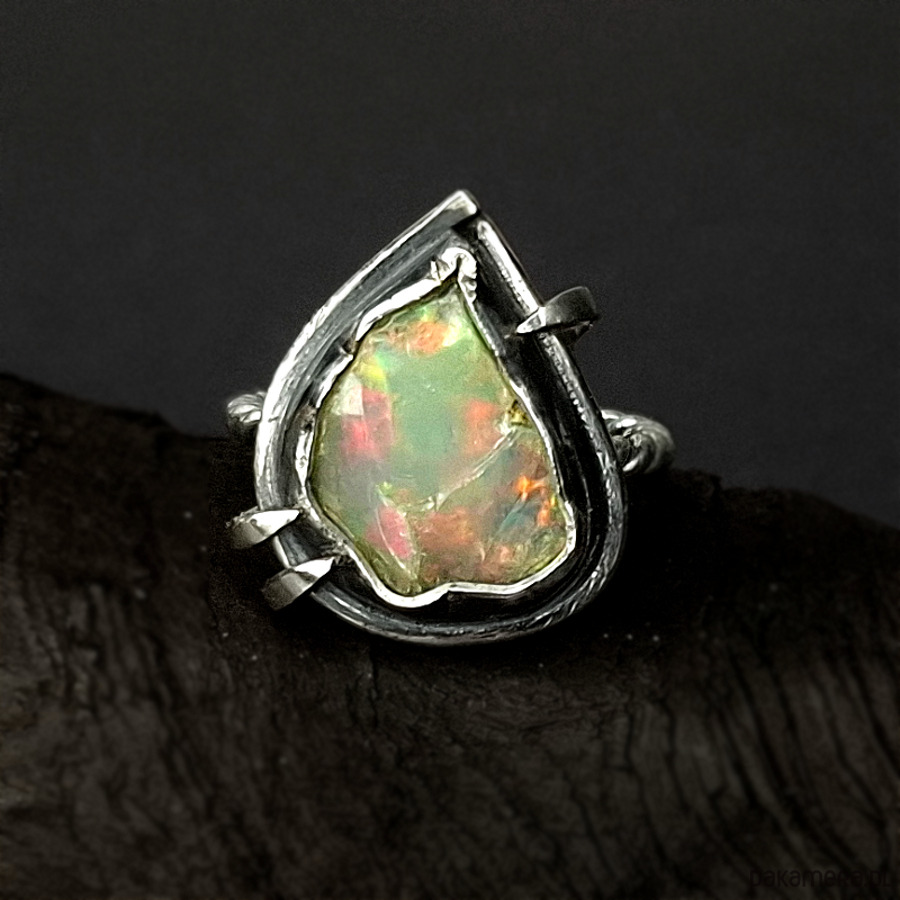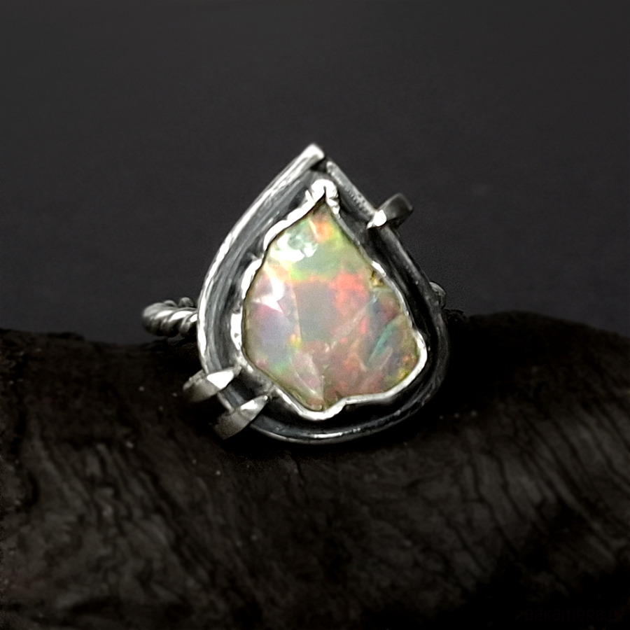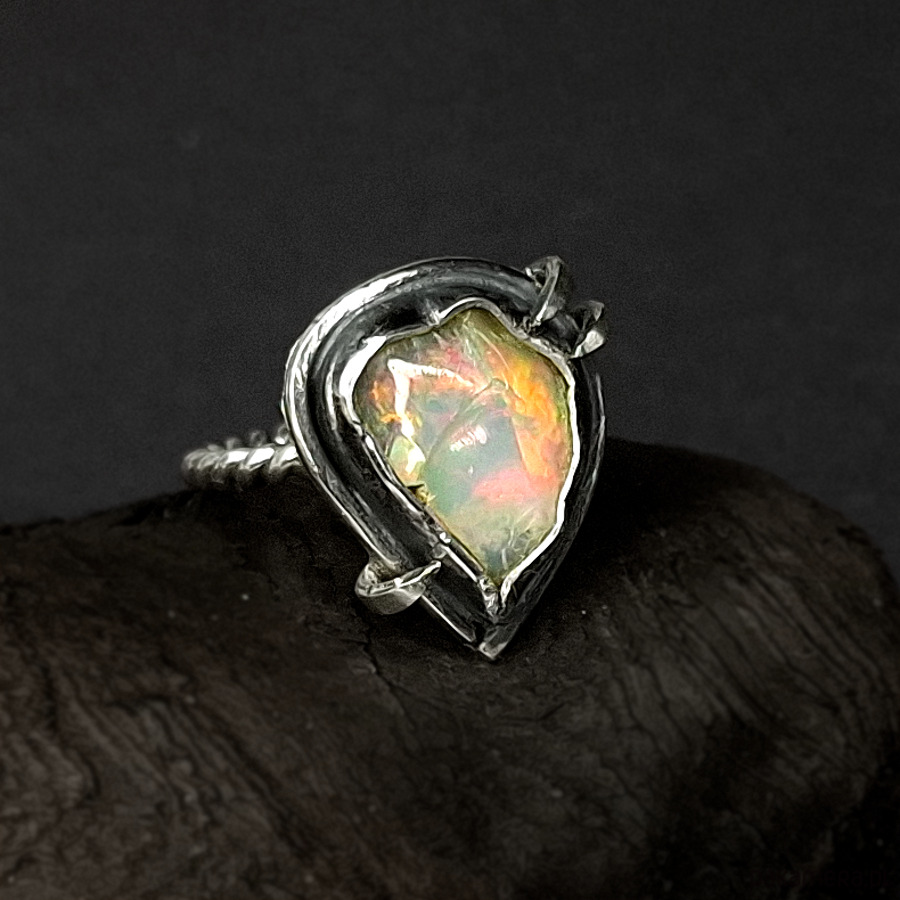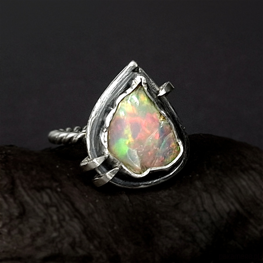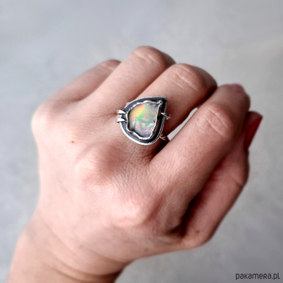 Srebrny, oryginalny, surowy pierścionek wykonany ze srebra 925, 930. Centrum biżuterii stanowi surowa skała opalu oprawiona w ciemne srebro. Surowość biżuterii łagodzą tęczowe barwy opalu. Całość została osadzona na ozdobnej obrączce. Wymiary korony pierścionka: ok 17x20mm. Rozmiar obrączki 14. Całość została zoksydowana i wypolerowana. Biżuteria zostanie ozdobnie zapakowana.