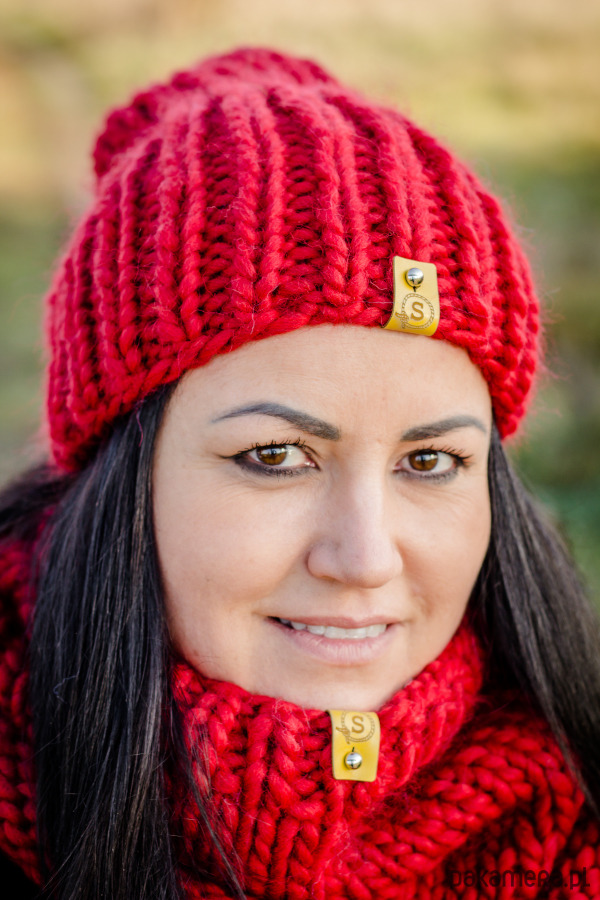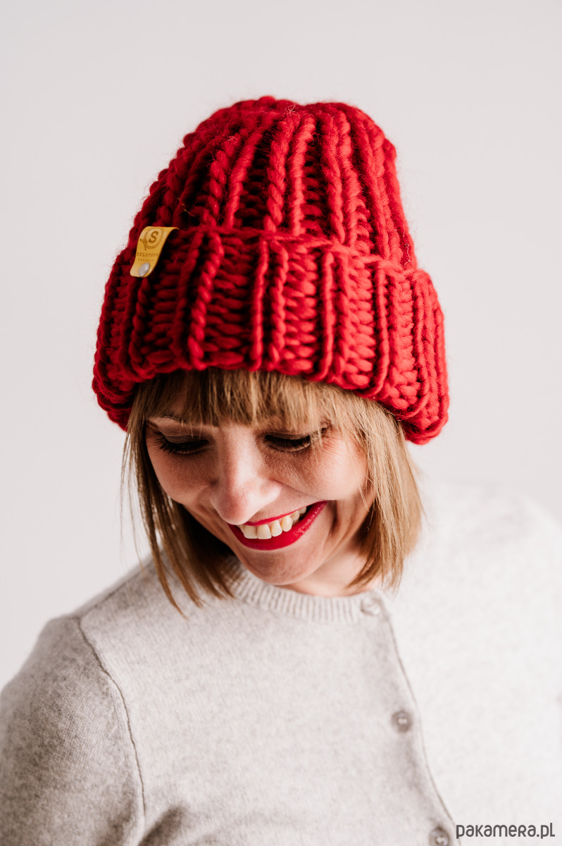 Czerwona czapka jest zrobiona wzorem ściągaczowym , co sprawia, że jest bardzo elastyczna