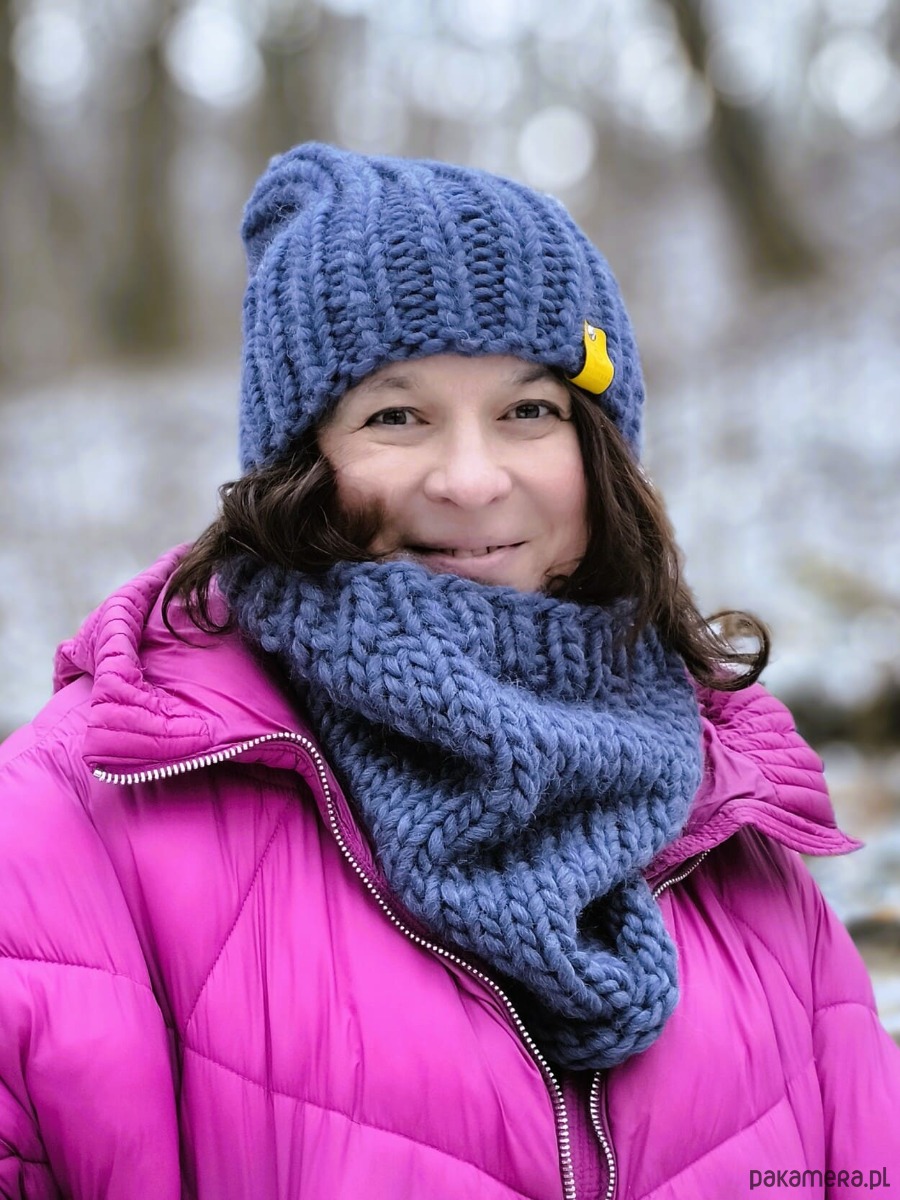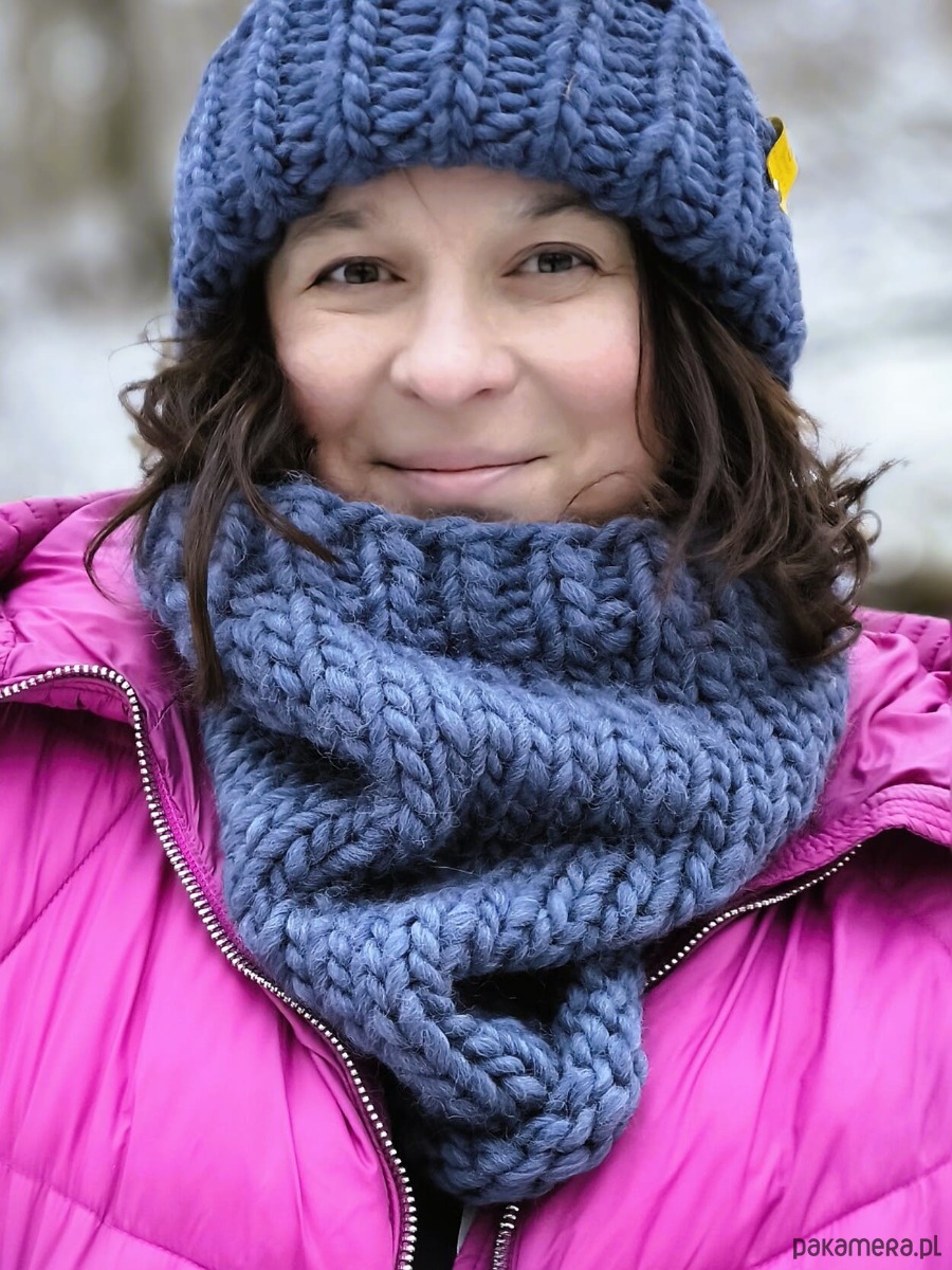 Komin w sam raz, ciaśniejszy przy szyi, luźniejszy na dole,