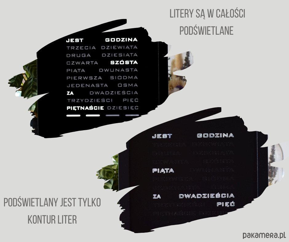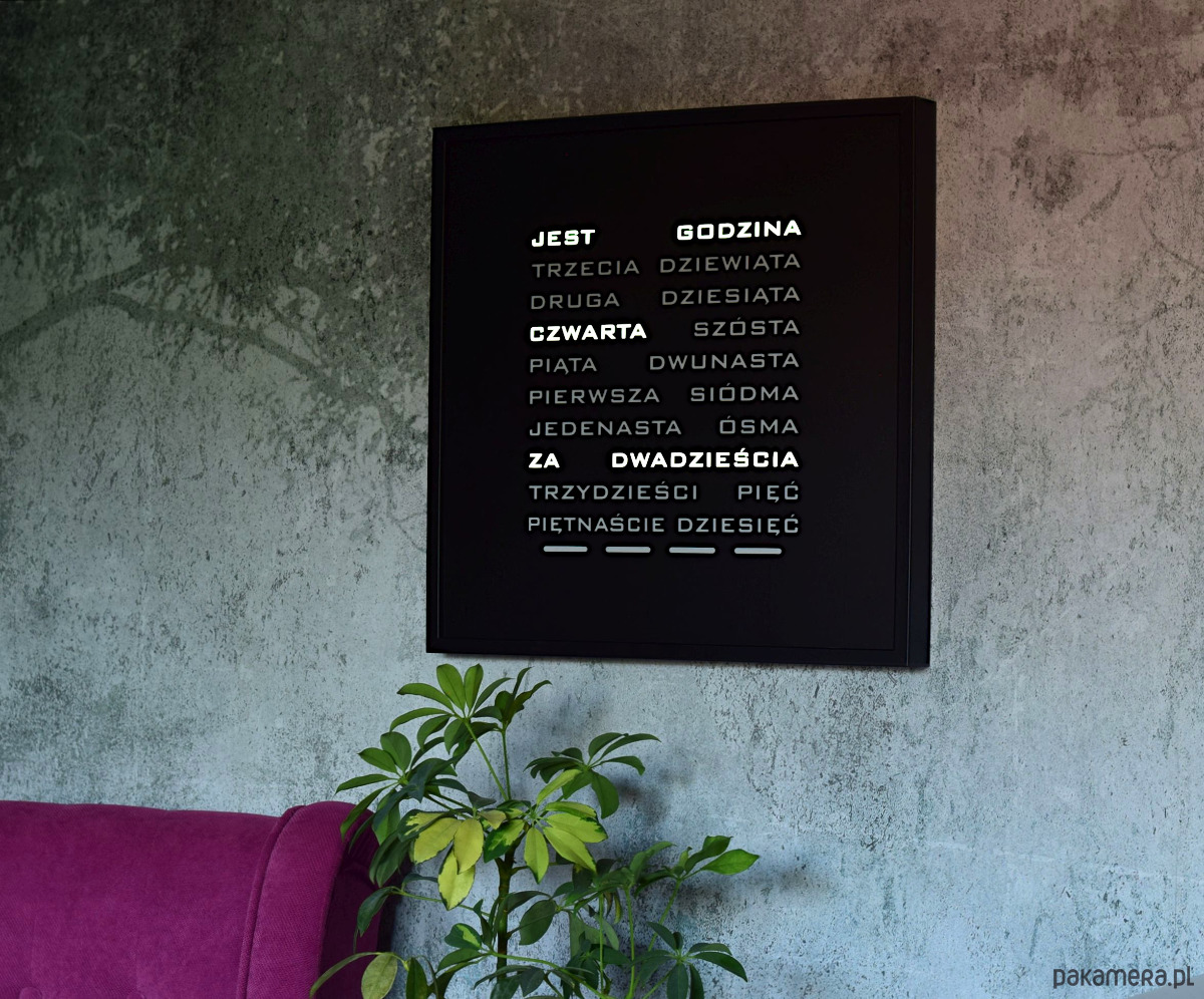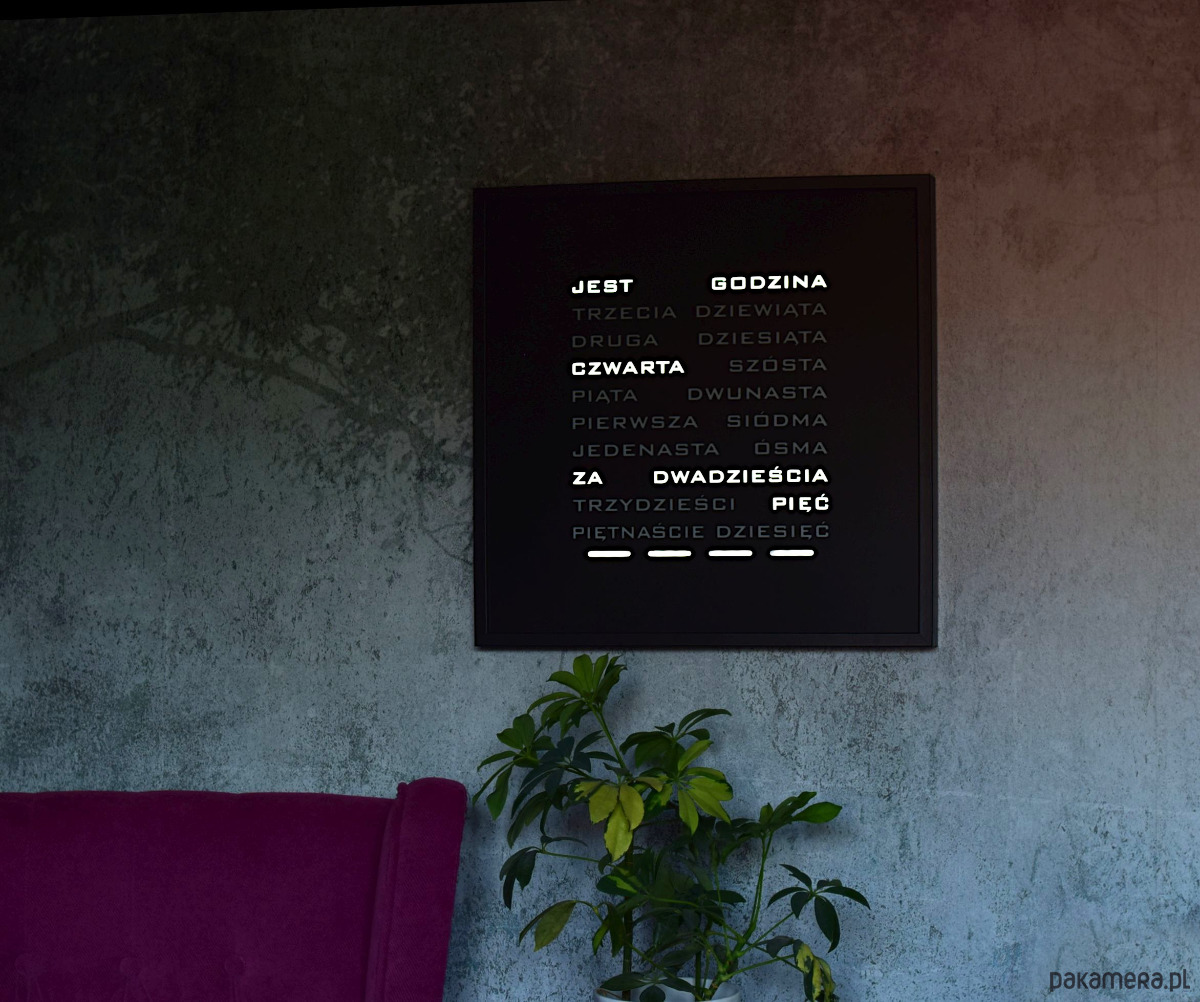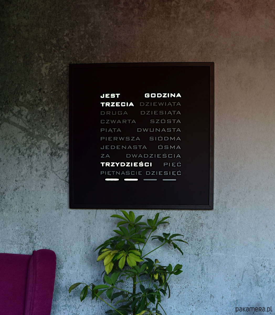 Zegarek wyświetlający słownie (w języku polskim) godzinę. Podświetlanie wyrazów w kolorze białym, w czarnej ramce.