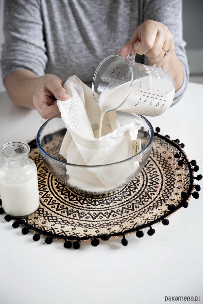 Woreczek wielorazowy Sakwabag do przygotowywania mleka roślinnego.