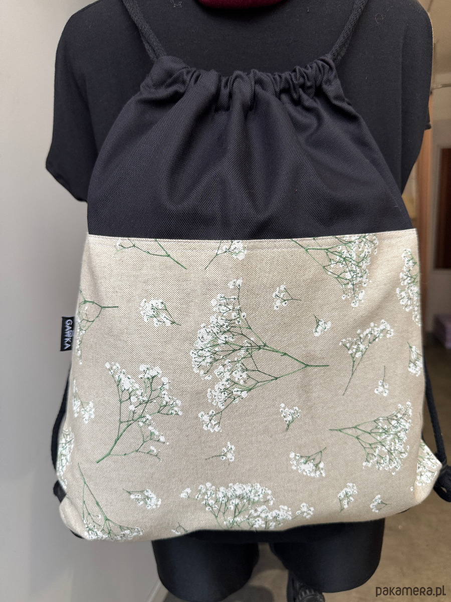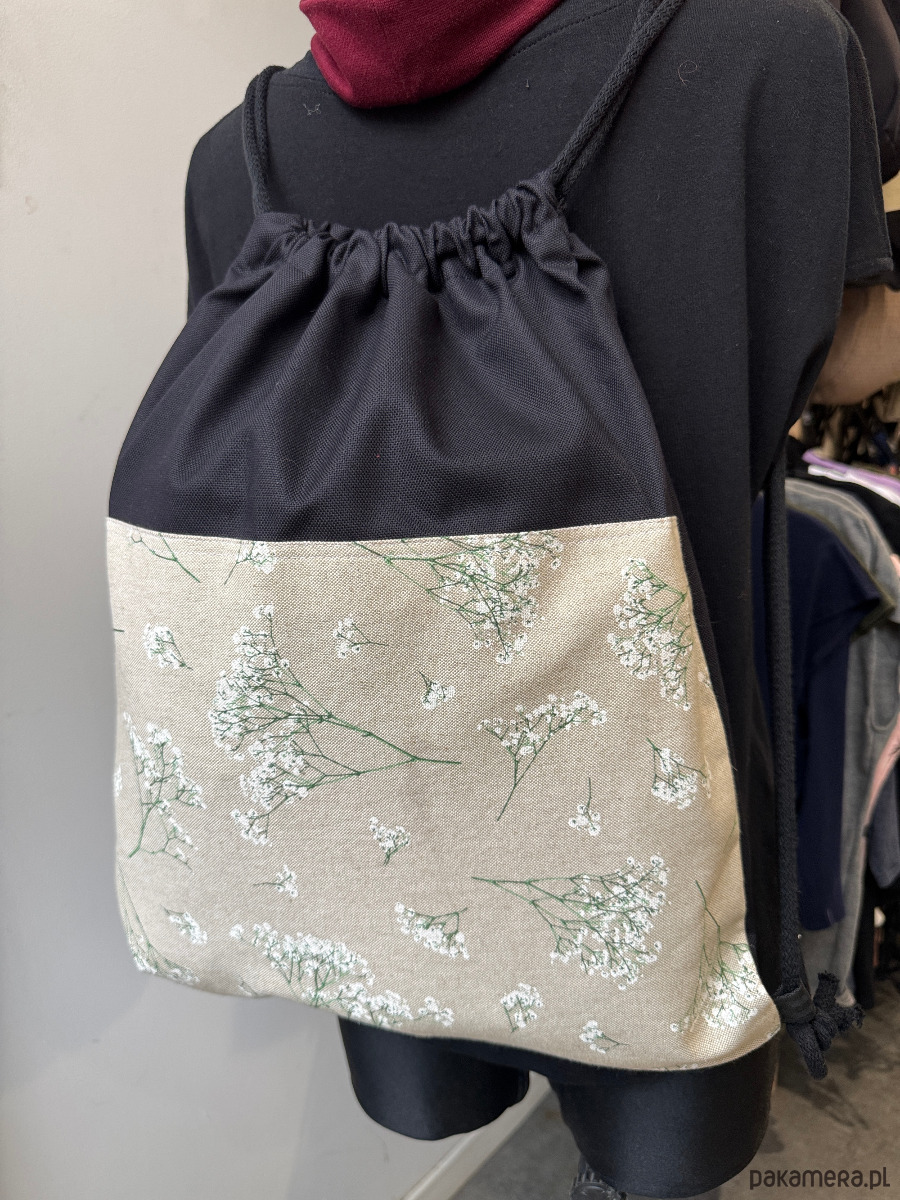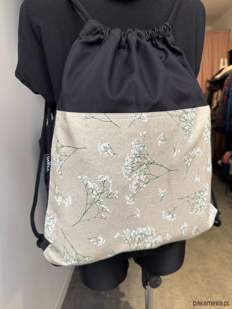 Worek z czarnej , mocnej bawełny z ultra dziewczęcą gipsówką z przodu.